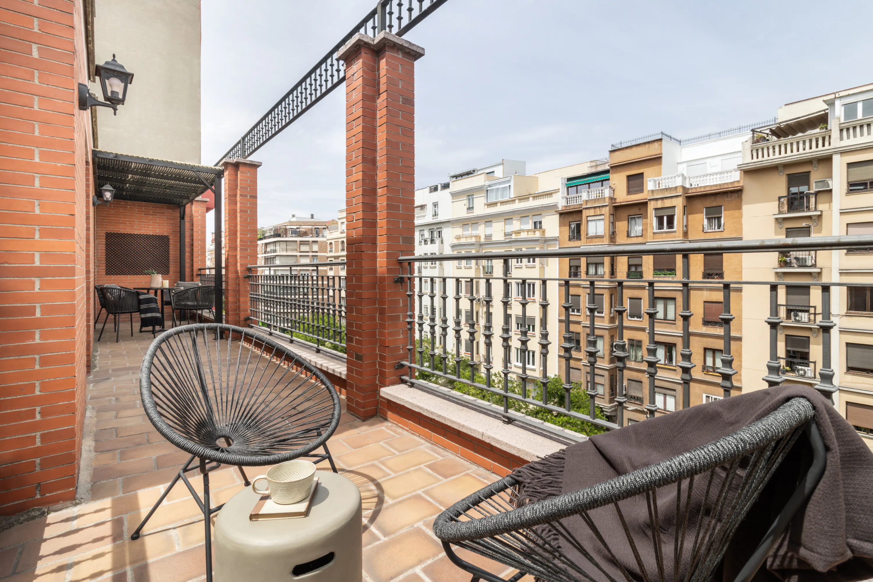 Sahara is a luxury in Goya. Making a grand entrance with 115 square meters of utter design and delight, Sahara feels and exudes royalty. Outside of the home, the neighborhood of Goya invites all to indulge in the Spanish tapas restaurants and charming small businesses scattered throughout. The two-bedroom, two-bath is as awe-inspiring inside as it is out. Marble floors are found throughout the home from the very entrance. Past the foyer, the first turn to the left leads to Sahara’s achromatic and spacious kitchen. Modern, white appliances and cooking utensils make the space fit for culinary experts. The end of the kitchen leads to a small balcony. Down the hallway, exiting the kitchen, the door on the left leads to Sahara’s first bathroom. A floating vanity and shower-tub combination make the space exude modernity. Across the hall is Sahara’s first bedroom. Aesthetic and functional, the multi-textured wall highlights the queen-sized bed to the left while the right side of the room is dedicated to built-in storage. At the far end is a dedicated workstation with natural light flooding in. Straight on down the hallway is the second bedroom. A natural fiber, floating headboard hangs above the queen-sized bed. To the left of the bed is a floor-to-ceiling closet. Where the hallway curves to the right, the next door leads to the open-concept living and dining area. Lantern lighting hangs above the four-person dining set. The living area consists of desert-like greenery and designer furnishings. Through the glass sliding doors, Sahara’s 25-square meter terrace is revealed. At the end of the hallway is Sahara’s office, coated in two-toned lush greens and earthy decor. All bedding and linens provided. *We welcome pets, fees are subject to apply. Guests will be informed of any additional charges in the final contract. *(hidden) cannot be held liable for any noises (construction, or street noise) done outside the apartment. We also cannot be liable for any rooms without air conditioning (all the rooms with air conditioner will be explicitly explained in our description). We will not accept any reservation cancellations or refund request related to these two issues. *Our in-house design team expertly selects all apartment furniture and decor to ensure the highest level of quality and comfort. As part of consistent home upkeep, design improvements, and photo staging, there may be minor differences in furnishings seen in the photos and what you find in the apartment. Inquire with a sales agent for any questions or doubts...