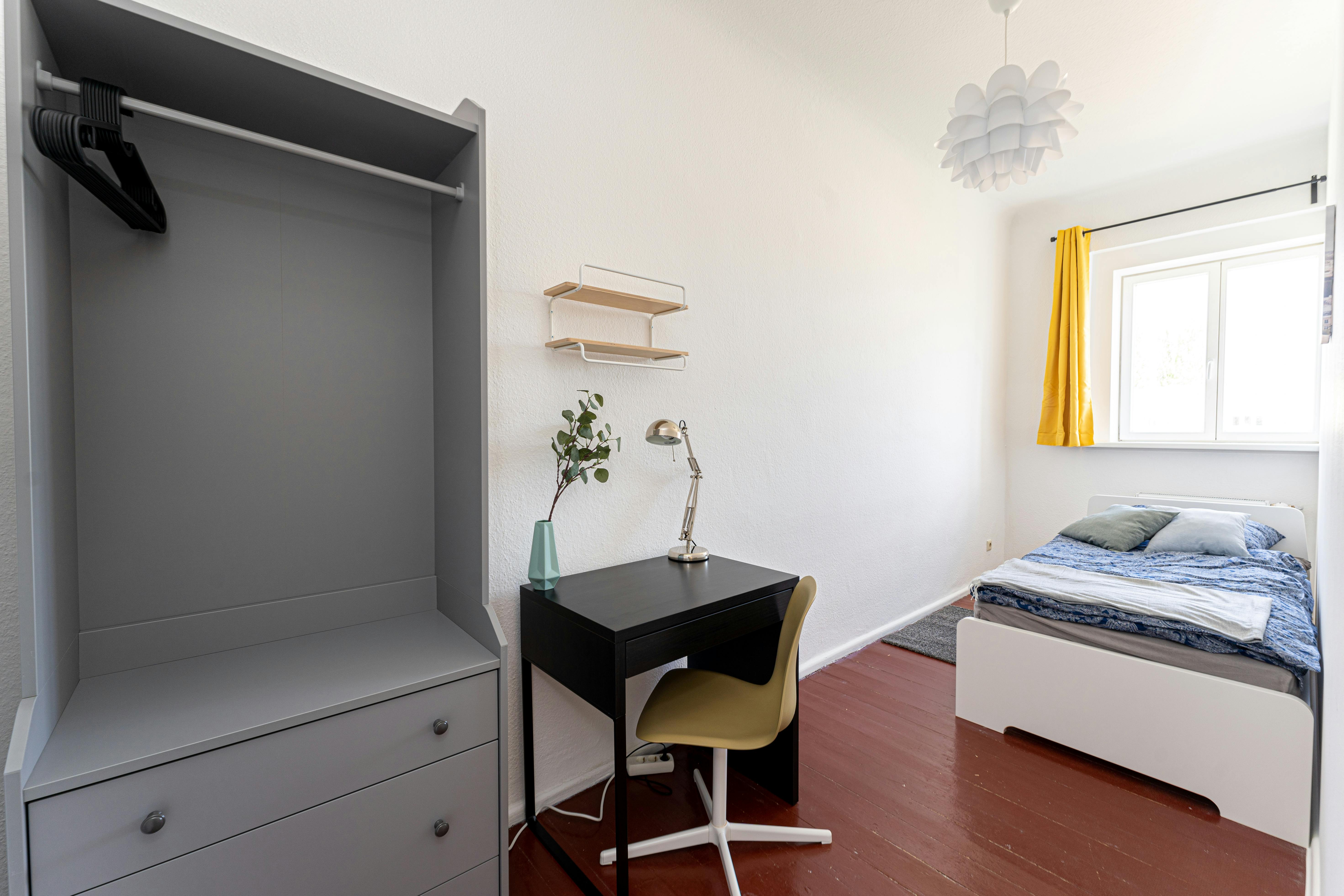 Room 3 Hi Guys, this is a fully furnished room in a shared flat. The room has a comfortable bed, a desk with chair and a wardrobe for your clothes. Also the common areas are fully equipped with washing machine, cooking equipment and all you need for your daily living. Anmeldung/Registration is possible. The monthly rent price is all inclusive (rent + heating + water + Internet + GEZ/german TV license fee). For the move in dates we have only the 1st or the 16th of each month a tenant can move in. In specific cases we have a flexible move in date, but this needs to discuss in our messages. plus the deposit of 950€, which needs to be payed before move in via bank transfer in a single payment....