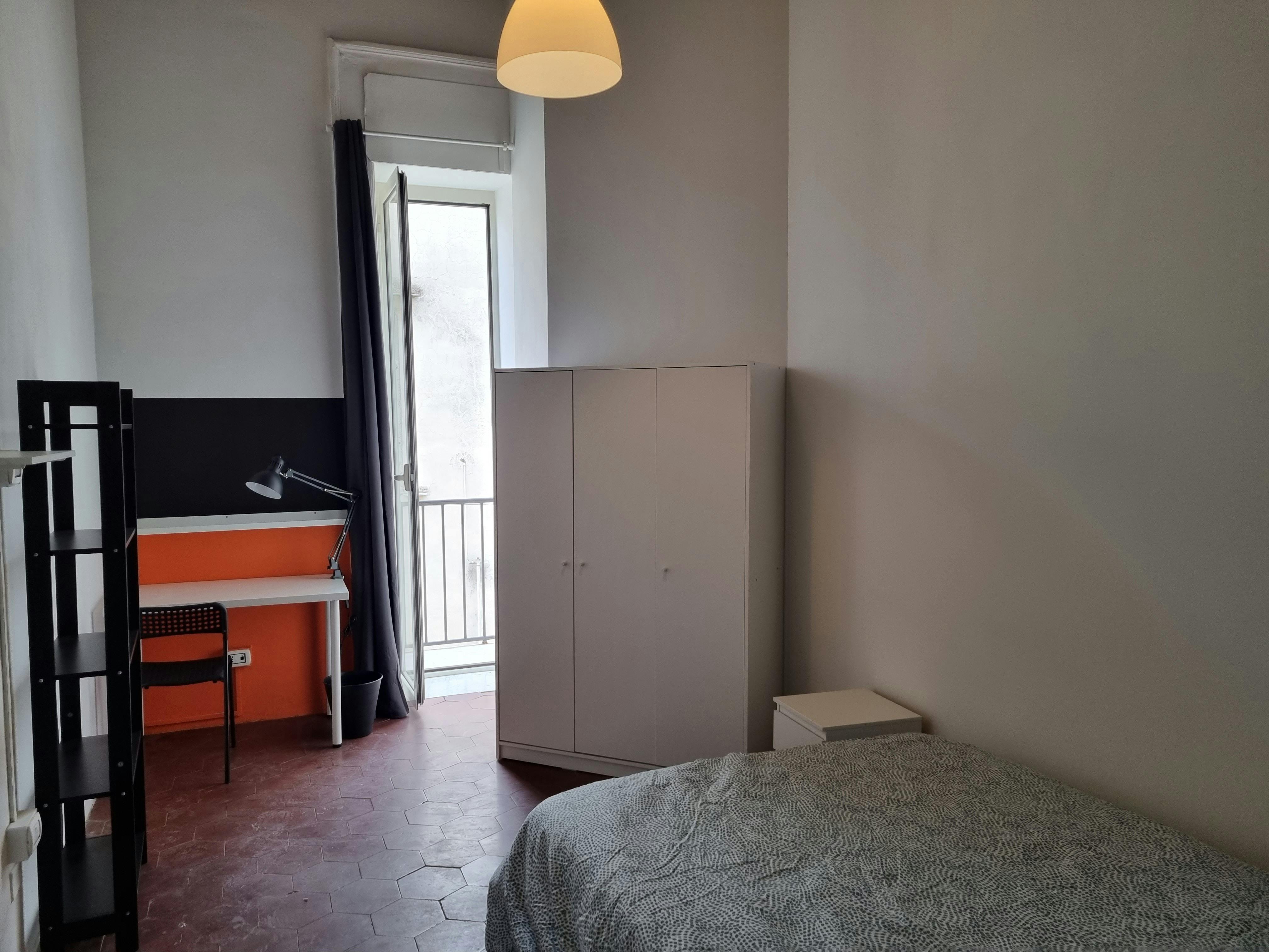 Spacious and modern single room with a balcony in a renovated, modern apartment with six bedrooms, two bathrooms, and a kitchen. The property is located on the fourth floor of a building without an elevator. The approximately 15 square meter room is fully furnished with a double bed, wardrobe, desk, bedside table, and lamp. The apartment is located near Via Duomo and Via Tribunali, about a 10-minute walk from Vanvitelli University and all the universities in the historic center. The area is full of shops, including cafes, bars, supermarkets, and various shops, and is a favorite among students for nightlife, as Piazza Bellini and Piazza San Domenico are just a few minutes' walk away. Rent & Costs All bills are included in the rent After booking, a €450 administrative fee is required to be paid ( please note: this payment need to be paid after booking not at the check in and This fee is not a deposit and is non-refundable at the end of tenancy) At the check in , will be asked to pay last month rent in advance ( you will not pay it at last month of tenancy)...