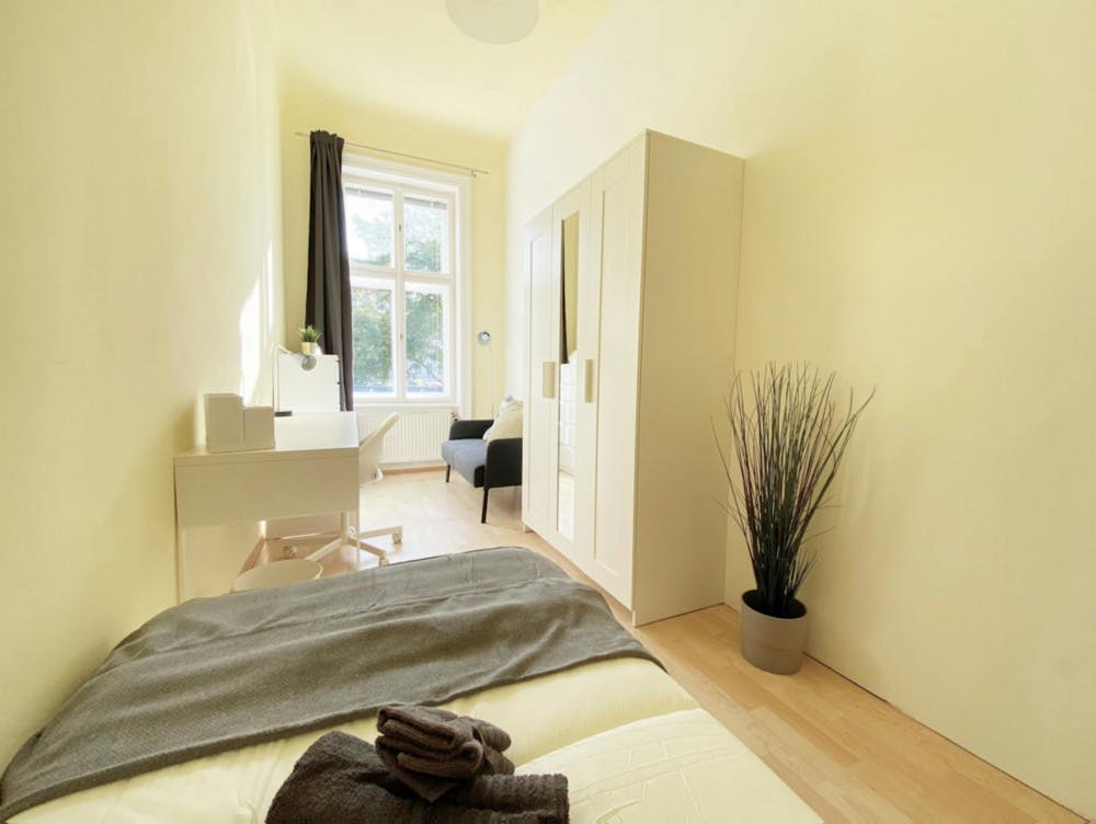 The room (number 1 on the floor plan) is located in the second district of Vienna “Leopoldstadt” and is ideal for those who like to live centrally and at the same time enjoy the benefits of large green spaces. The Augartenpark and the Wiener Prater are located in the immediate vicinity and the famous Danube Canal and the Danube is only a few minutes’ walk away. In the summer, the Donauinsel, located in the north, is a great place to enjoy the warm days and cool off in the river. The shared flat (4 rooms) is mixed and ideal for all newcomers to get to know new people. It is located on the 2nd floor of a nice building and is fully furnished. It is equipped with a kitchen with a fridge, cooking utensils and crockery, a washing machine and WiFi. All rooms are of course separately accessible. In your room you will have a single bed, a wardrobe with mirror, a bedside table, a desk, a chair, shelves and lamps. Connection to public transport: The area offers you plenty of shopping and excellent links to public transport: City center (Schwedenplatz) 10 min WU Vienna 18 min TU Vienna 18 min UNI Vienna 20 min If you are planning to get a bike, there is a space for it on the property. You will love your stay in this area of Vienna...