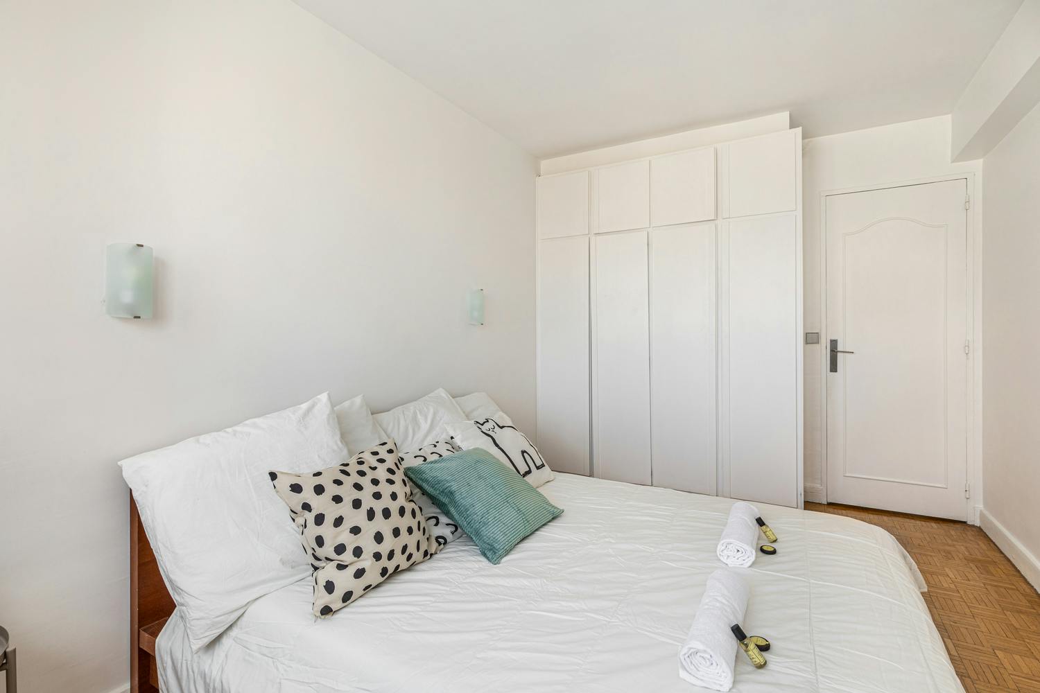 Welcome to my home! The spacious living room features a comfortable sofa-bed, a wide-screen smart TV to watch all your favorite shows through multiple streaming options, and a dining table enough to accommodate four. The space includes floor-to-ceiling windows that lead onto a balcony where you can enjoy a coffee in the morning or a glass of wine in the evening while contemplating the magnificent Eiffel Tower. The kitchen is fully equipped with essential cookware and cutlery that you will need to whip up a delicious meal including a stove, an oven, and a coffee maker. Your home away from home is decked out with a washer and ironing equipment. The bedroom is equipped with a queen-size bed lined in high quality linens to ensure a good night's rest and plenty of storage place for your belongings. The bathroom has all the amenities you will need to freshen up, including fresh towels and toiletries for your convenience. The flat is always professionally cleaned and sanitized for your health and safety. Please note that there are ongoing facade renovations until January 2024. Note: All the bills are inclusive (heating, hot water, wifi...) Enjoy your stay...