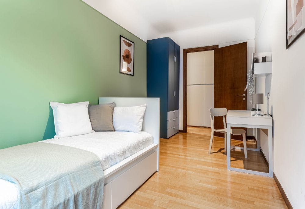 Wonderful four bedroom apartment in Milan, via Salutati - Vercellina - Washington The apartment is situated in a convenient and strategic area, ideal for university students and young professionals. From here, you can easily reach Il Sole 24 Ore Business School, University of Milan, Marangoni, Cattolica, and more. The neighborhood provides all the essentials, including supermarkets and shops. This wonderful apartment features an entrance hall, a fully equipped kitchen, four bedrooms with French or single beds—each with a balcony, terrace, or window—two closets, and two bathrooms with shower and/or bath. The flat is located in the heart of the residential area Washington - Solari. This neighbourhood counts with many supermarkets, shops and services for any need. - Università Cattolica, 20 minutes by bus 50/58; - Il Sole 24ore Business School, 20 minutes by bus 91; - Università Cattolica (Pagliano), 15 minutes by bus 91; - IULM, 18 minutes by bus 90. The strategic location of the apartment will let you enjoy all the activities in Milan. You will be able to explore the city both by walk or by usinng the public transportation: - Metro Red line Pagano/Wagner/C o nciliazione , 10 minutes walking; - Bus 50/67/90/91. Milan is the Italian fashion capital and recently became one of the trendiest destinations in Europe for young internationals. It boasts a priceless historical heritage, gastronomic culture and visionary designers. You will be amazed by big, elegant palaces, tree-lined boulevards and cutting-edge boutiques all around Milan. Moreover, it has plenty of restaurants and clubs that liven up the city all year round, but also famous historical sights such as: Duomo, Castello Sforzesco, Quadrilatero della Moda, Galleria Vittorio Emanuele, Palazzo Reale and Cenacolo Vinciano. - Don't smoke - Pets are not allowed - Parties are forbidden - Take out the trash daily - Short-term visits are allowed Cozy single room with balcony in the center of Milan Wonderful bright single room with a balcony in Milan. The room features a single bed, a bedside table, a desk with a lamp, and a double wardrobe with internal drawers. An ideal solution for international university students and young professionals! ALL BILLS ARE INCLUDED up to 50 euro of expenses per month (if you will do a normal amount of usage, you would not have to pay for it!). After the payment of the first month rent on HousingAnywhere, to finalize the reservation, the tenant has to pay the deposit and the admin fee. The admin fee covers: -weekly cleaning service of the common areas for the entire duration of the contract; - contract registration fees (registration tax, stamps and registration fee); -maintenance. Contracts can’t end on 30 of April - 31 of May - 30 of June. Cancelling contract in advance is possible with three months notice period only after three months contract. If you cancel the contract before the natural ending you have to pay 200€ penalty...