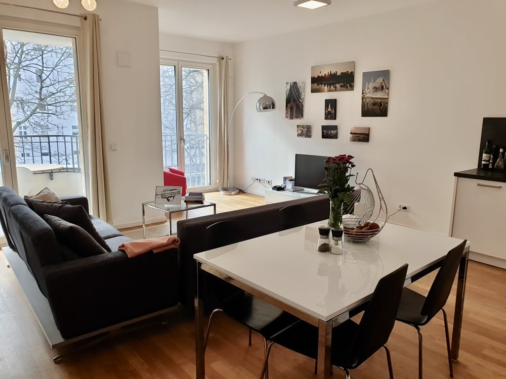 Schöne Neubau-Wohnung mit zwei Zimmern. Diese Wohnung ist voll eingerichtet, mit moderner Küche und hochwertigen Elektrogeräten. Im Wohnzimmer steht ein großer curved Smart TV, ein Esstisch für 4 Personen. Die gemütliche Couch kann zum Schlafsofa umgebaut werden. Im Schlafzimmer steht ein Kleiderschrank, ein großes Bett sowie ein Schreibtisch - ideal für die home-office Zeit. Für Kaffee-Liebhaber gibt es eine tolle DeLonghi Nespresso Maschine. Den Kaffee kann man gemütlich auf dem Balkon mit Südseite genießen. Füßläufig finden Sie: - 3 min. to U-Bahn Blissestrasse, Apotheke und Bäcker - 2 min. Commerzbank, Sparkasse EC-Automaten - 7 min. Lebensmittelgeschäfte (Lidl & EDEKA) - 5 min. zum Volkspark Wilmersdor...