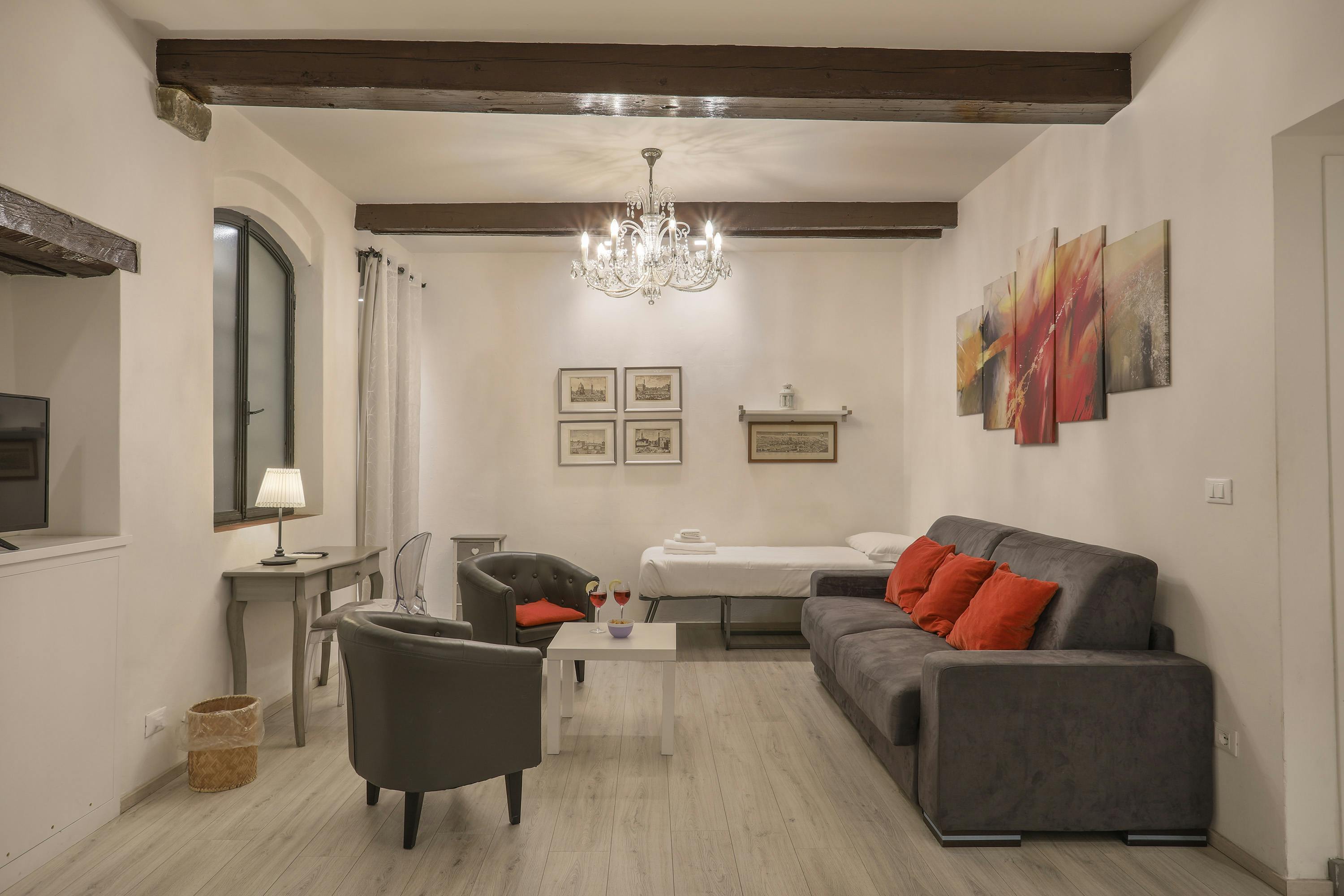 Move into this astonishing property! A modern and trendy design gives the space a luxurious feeling. The interiors have bright and full of light, giving the space an alluring energy. A single flight of stairs separates the condominium entrance from the secure armored door of the apartment, to ensure the safety of our guests. The hallway leads to the main room, equipped with all comforts and tastefully furnished in Shabby Fusion style, where the kitchen is located, small and functional, with induction hob, microwave, espresso coffee machine, toaster, kettle, crockery and everything you need for your meals and the living area. A comfortable and large sofa that transforms into a real double bed 160x200cm with an orthopedic mattress and wooden slats will welcome you for evening relaxation and a chat with your friends, or to watch TV. In the bedroom, you can sleep comfortably and store all your luggage in the wardrobe at your disposal and in the chest of drawers. The bathroom has all the comforts: sink, a large shelf to place your personal items, toilet, bidet, and shower. It is located in Via Vinegia, behind Palazzo Vecchio, in a strategic position for visiting the city, in a quiet street, adjacent to the more famous Via de' Neri, where some of the most typical and tasty restaurants in the Centro di (hidden). The neighborhood is very alive and vibrant! The area is highly commercial, you'll find stores, boutiques, international restaurants, and much more down every block! On foot, you can easily reach the bus stop and a handful of stores and nice places to visit! + The house is provided without bed linen and towels. Linen can be rented at a cost of €7 per week for a single bed set or €10 per week for a double bed set (sheets + towels). + At the time of booking, the following payments are required: the first month’s rent, the security deposit, the first month’s utilities, and the final cleaning fee. These payments must be made within 7 days of booking confirmation; otherwise, the reservation will be cancelled. + Every 30 days from the start of the lease, the rent and utilities for the following month must be paid...