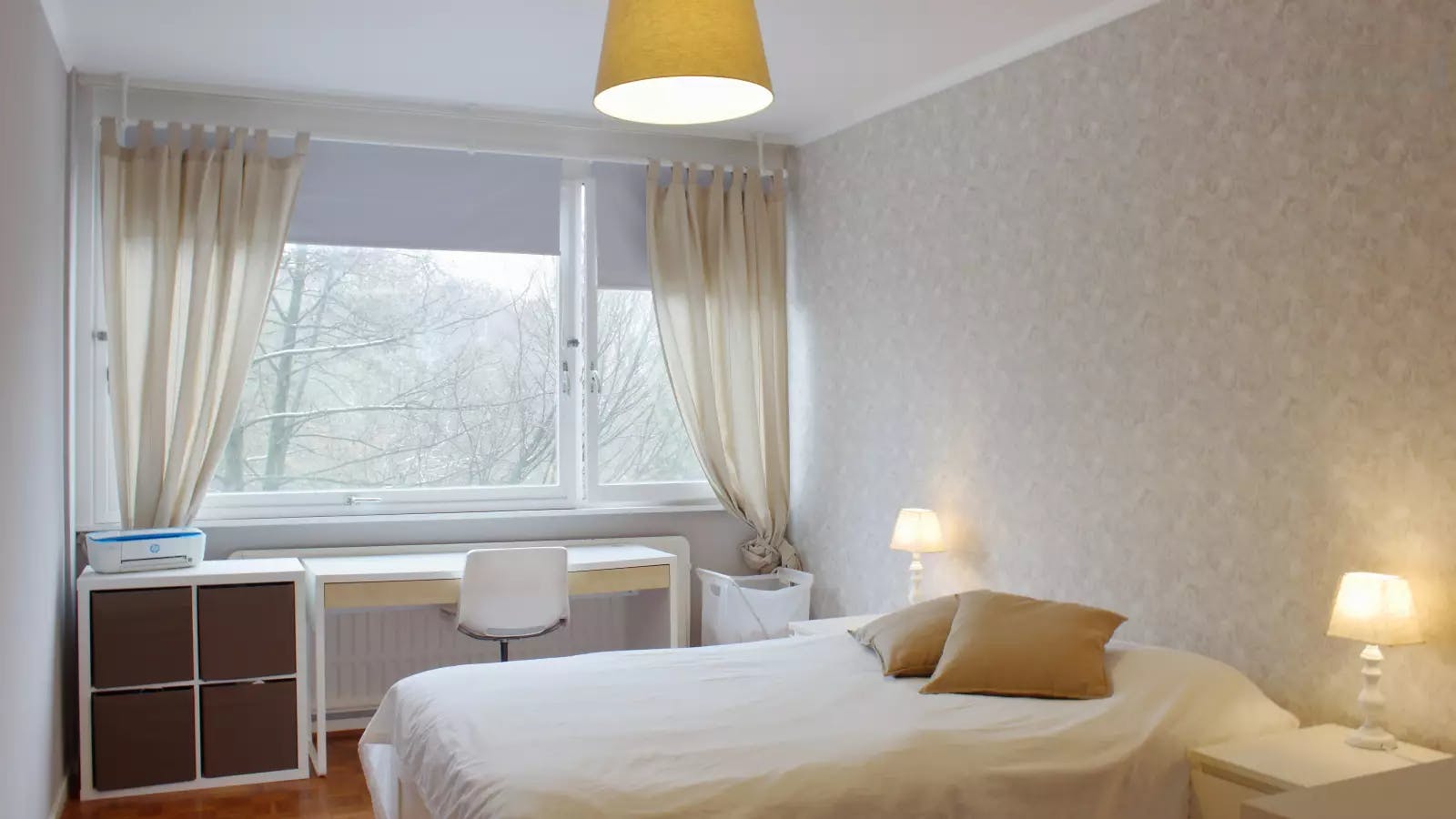 EN The apartment is located in Ixelles, avenue du derby 26. It is 10 minutes from the ULB (by car or public transport). Facing the Bois de la Cambre. There are several tram / buses that pass nearby and a small train station a 3 minute walk away. There is also free outdoor parking for building occupants and their guests. The apartment is located in a luxury building surrounded by a garden, on the 4th floor with elevator. There is a concierge who takes care of the maintenance of the common areas. It includes an entrance hall with guest WC, a living room with lounge, dining room (6 people), kitchen (fridge, freezer, microwave, dishwasher, oven, 4 ceramic hobs. The kitchen overlooks a balcony with a small table and chairs (facing south) There are 2 bedrooms of 16m2 (double bed, 2 bedside tables, desk, office chair, shelf, dressers and wardrobe. There are also 2 large closets in the night hall (1 per person) and finally a bathroom. bathroom (washing machine, dryer, bath shower, 2nd toilet, sink, cupboards). The apartment is furnished. There is mattress protector, duvet and cushions. The kitchen has all the necessary dishes and cooking utensils. There is also a coffee machine. There are also: cleaning equipment, vacuum cleaner, iron and ironing board. The rent is 550 € per room and 100 € charge (wifi, water, gas, electricity, lift, concierge, maintenance of the outbuildings, maintenance of the gardens). One person per room, preferably a woman. occasional visits are of course authorized. The accommodation is 100m2. I ask for 1/2 month's rent as a guarantee, ie 275 €. Domiciliation: OK FR L’appartement se trouve à Ixelles, avenue du derby 26. Il est à 10 minutes de l’ULB (en voiture ou transports en commun). Face au bois de la cambre. Il y a plusieurs tram/bus qui passent à proximité et une petite gare à 3 minutes à pied. Il y a également un parking extérieur gratuit pour les occupants de l’immeuble et leurs invités. L’appartement se trouve dans un immeuble de standing entouré de jardin, au 4ème étage avec ascenseur. Il y a une concierge qui s’occupe de l’entretien des parties communes. Il comprend un hall d’entrée avec WC visiteur, un living avec salon, salle à manger (6 personnes), cuisine (frigo, congélateur, micro-ondes, lave-vaisselle, four, 4 taques de cuisson vitrocéramiques. La cuisine donne sur un balcon avec une petite table et chaises.(plein sud) Il y a 2 chambres de 16m2 (lit 2 personnes, 2 tables de nuit, bureau, chaise de bureau, étagère, commodes et armoire. Il y a également 2 grands placards dans le hall de nuit (1 par personne) et enfin une salle de bain (machine à laver, sèche linge, bain douche, 2ème toilette, évier, placards). L’appartement est meublé. Il y a protège matelas, couette et coussins. La cuisine dispose de toute la vaisselle et ustensiles de cuisine nécessaire. Il y a également une machine à café. Il y a aussi: matériel de nettoyage, aspirateur, table et fer à repasser. Le loyer est de 550€ par chambre et 100€ de charge (wifi, eau, gaz, électricité, ascenseur, concierge, entretien des communs, entretien des jardins). Une personne par chambre, de préférence une femme. les visites occasionnelles sont bien sur autorisées. Le logement fait 100m2. Je demande 1/2 mois de loyer en garantie soit 275€. Domiciliation : O...