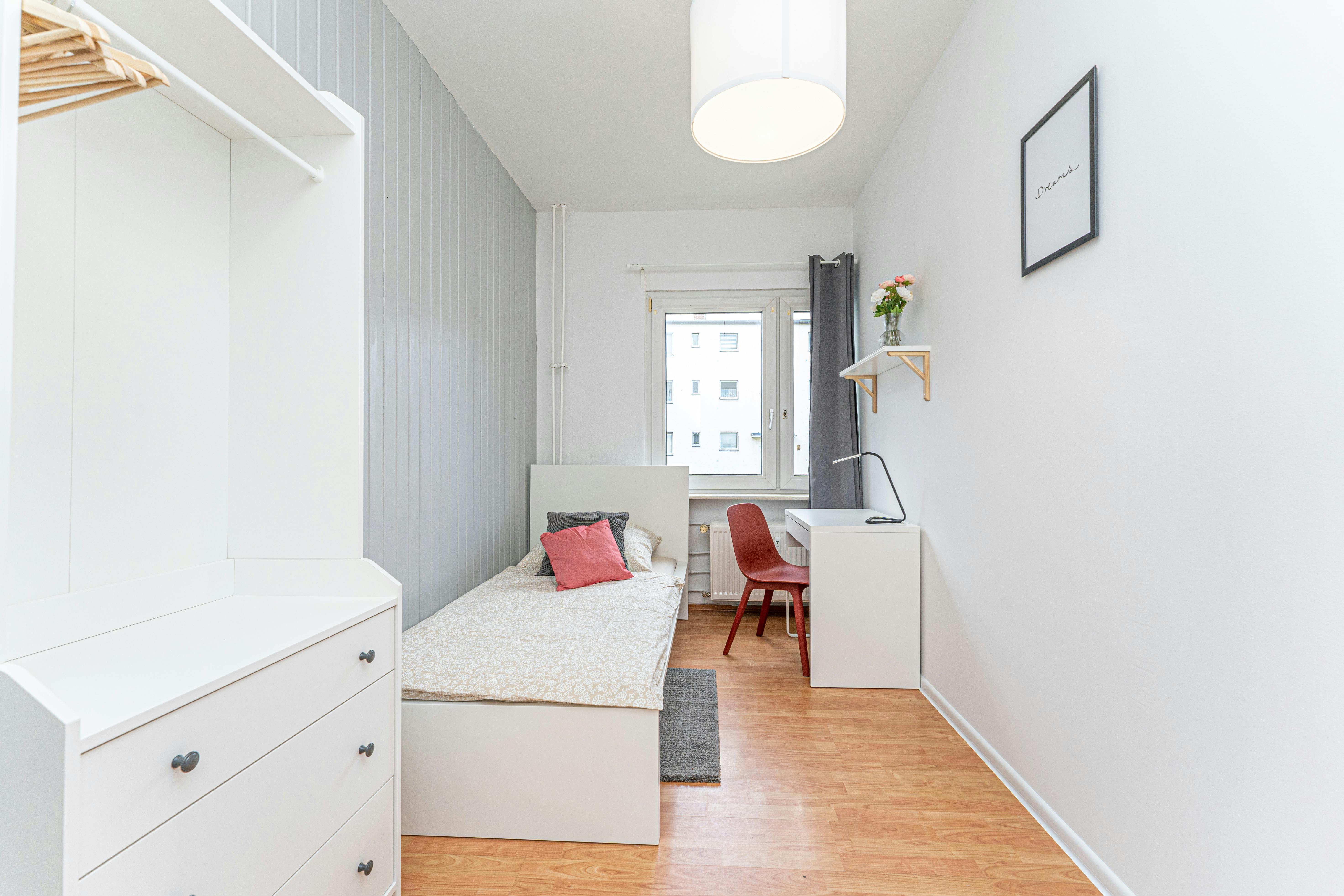 Room 3 Hi Guys, this is a fully furnished room in a shared flat. The room has a comfortable bed, a desk with chair and a wardrobe for your clothes. Also the common areas are fully equipped with washing machine, cooking equipment and all you need for your daily living. Anmeldung/Registration is possible. The monthly rent price is all inclusive (rent + heating + water + Internet + GEZ/german TV license fee). For the move in dates we have only the 1st or the 16th of each month a tenant can move in. In specific cases we have a flexible move in date, but this needs to discuss in our messages. plus the deposit of 950€, which needs to be payed before move in via bank transfer in a single payment....