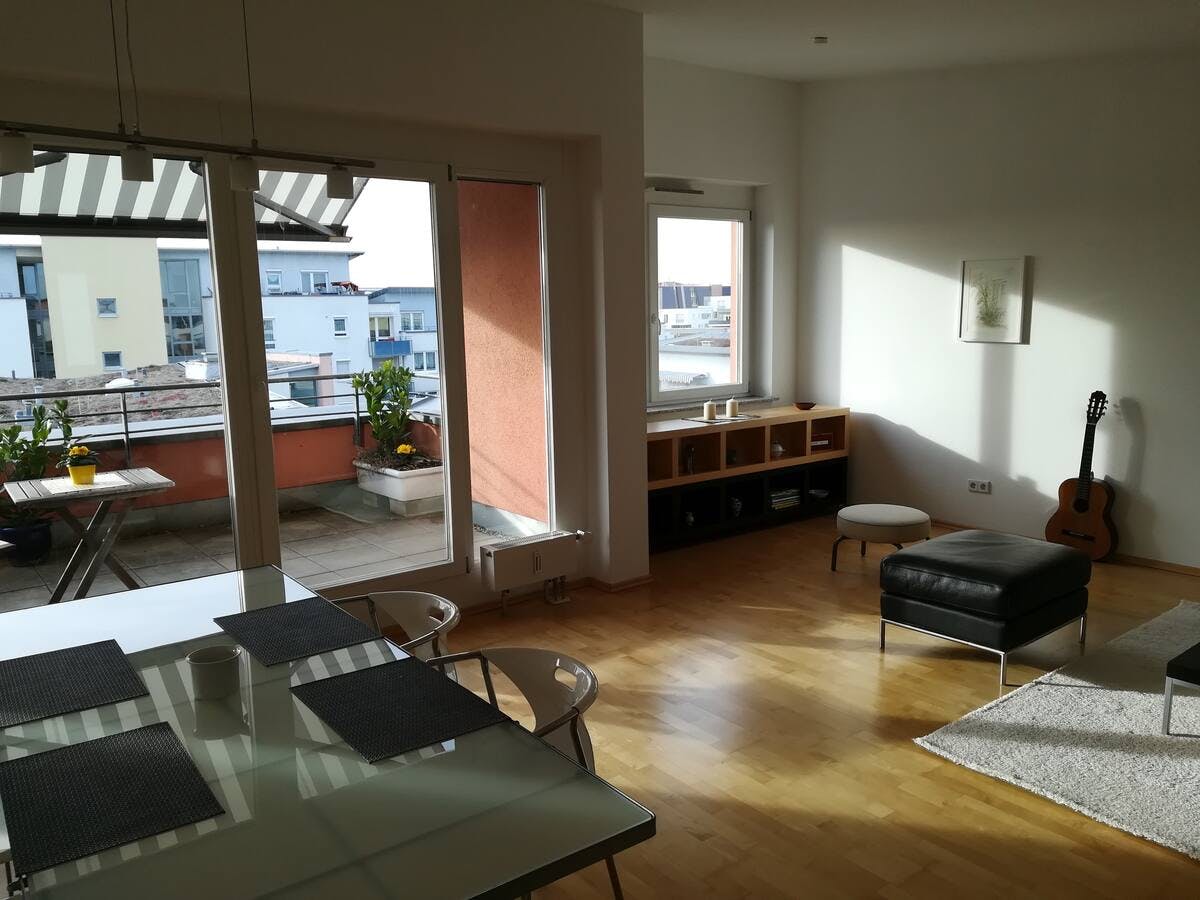 Elegant penthouse with roof terrasse and a view This elegant penthouse is situated in a popular residential area close to Stuttgart and in walking distance to fields and forests. It features a roof terrace with a wide view to the west. Full equipment with washing machine and dryer, modern kitchen with dishwasher and induction cooker, leather sofa, and two bath rooms are included. A carport is available for your car. You can reach the A8 motor way in five minutes. The suburban train station is in 4 min walking distance, to reach the airport 10 min, Stuttgart main station in 25 min. Supermarkets, shops, restaurants and fitness center are in walking distance. Kindergarten and schools are just nearby...