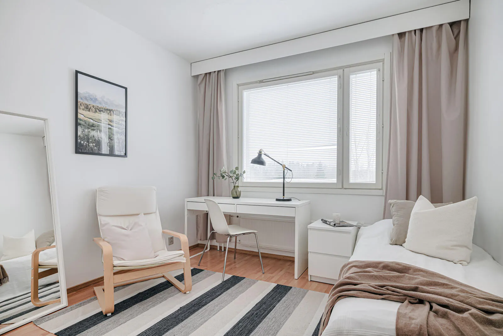 *** Large, fully furnished private room suitable for students & young professionals *** *** All-inclusive rate: water, electricity, internet *** *** Safe locality, 20min from city centre by train *** *** We are a registered Finnish company with a superior customer service *** ROOM This cozy fully furnished room is 11sqm, and it has everything you need for a comfortable daily life: bright and open with modern Nordic-style furniture. The furniture includes a bed, night table, desk space, chairs, lamps, wardrobes, window blinds, and bedlinen – you will have less to worry, and you can focus on getting the most out of your stay! APARTMENT & BUILDING This spacious apartment has a large, fully-equipped kitchen to ensure you will be able to prepare your favourite daily meals. The kitchen has dedicated storage space for tenants. The apartment has 2 toilets and a bathroom. The fixtures include: • cooker/oven • microwave oven • fridge/freezer • dishwasher • washing machine • iron/board • coffee machine & electric kettle • kitchen utensils • vacuum cleaner • Fast-speed WIFI, and TV This low-rise building has an elevator, and a sauna that you may use free of charge once a week. Extra luggage and belongings may be stored in the apartment’s dedicated storage space. Bicycles, and outdoor activity equipment have their own dedicated storage space. LOCATION & DISTANCES This is a safe Helsinki locality. Total travel time from the apartment to Helsinki City is 20mins by train. Airport is 30mins by train. Campuses such as Haaga-Helia University of Applied Sciences and Helsinki Business College are few train stops away. Given the location on Ring-I road, the area has great accessibility and public transportation options. The area offers parks and an open air gym for outdoor activists, but provides also wide range of daily services from grocery shops, to restaurants and coffee shops. Rental bikes can be rented nearby to explore the vast parks of Helsinki. There is public library offering workspaces, and quiet areas free of charge. The area has its own large shopping complex Kaari, which has a large 24/7 department store, restaurants and approximately 80 specialty shops. It is the 5th largest shopping centre in greater Helsinki area and 9th largest in Finland. • 3min Grocery Shop, ATM, library, train station • 20min Helsinki Central Train Station & City Centre • 10min Kaari Shopping Centre POLICIES & DOCUMENTS REQUIRED • Passport / official ID of the tenant • Rent payment: 2nd of each month • Payment method: bank transfer MOVE-IN • Keys will be delivered to our key service partner near the apartment following the completion of payments • You will be able to pick-up the keys at a time most convenient to you typically from 08:00 – 22:00, Monday to Sunday • You will need to prove your identity at the pick-up LANDLORD We are a registered Finnish company founded in 2005, specializing in fully furnished stylish private rooms in central locations with all-inclusive rates. We are the top advertiser in Finland with over 350 successful bookings through Housing Anywhere. We manage only our own properties. We are driven by passion to offer tenants around the world a simple moving process, superior customer service and an enjoyable stay. We have the honor to host +150 tenants annually in our apartments that are on average less than 15mins from Helsinki city center. Our team is dedicated of making your move-in as effortless and stress free as possible. Regardless of the tenure of your stay, we have the perfect option for you. We welcome you to join our community of international residents, and allow us to offer you a place to stay. We are looking forward hearing from you. *** Please be aware that HousingAnywhere is an online booking service, and the policy does not allow exchanging of contact information or apartment viewings. If you would wish to book an apartment through us, kindly send us a message or booking request, and we will address all your enquiries. **...