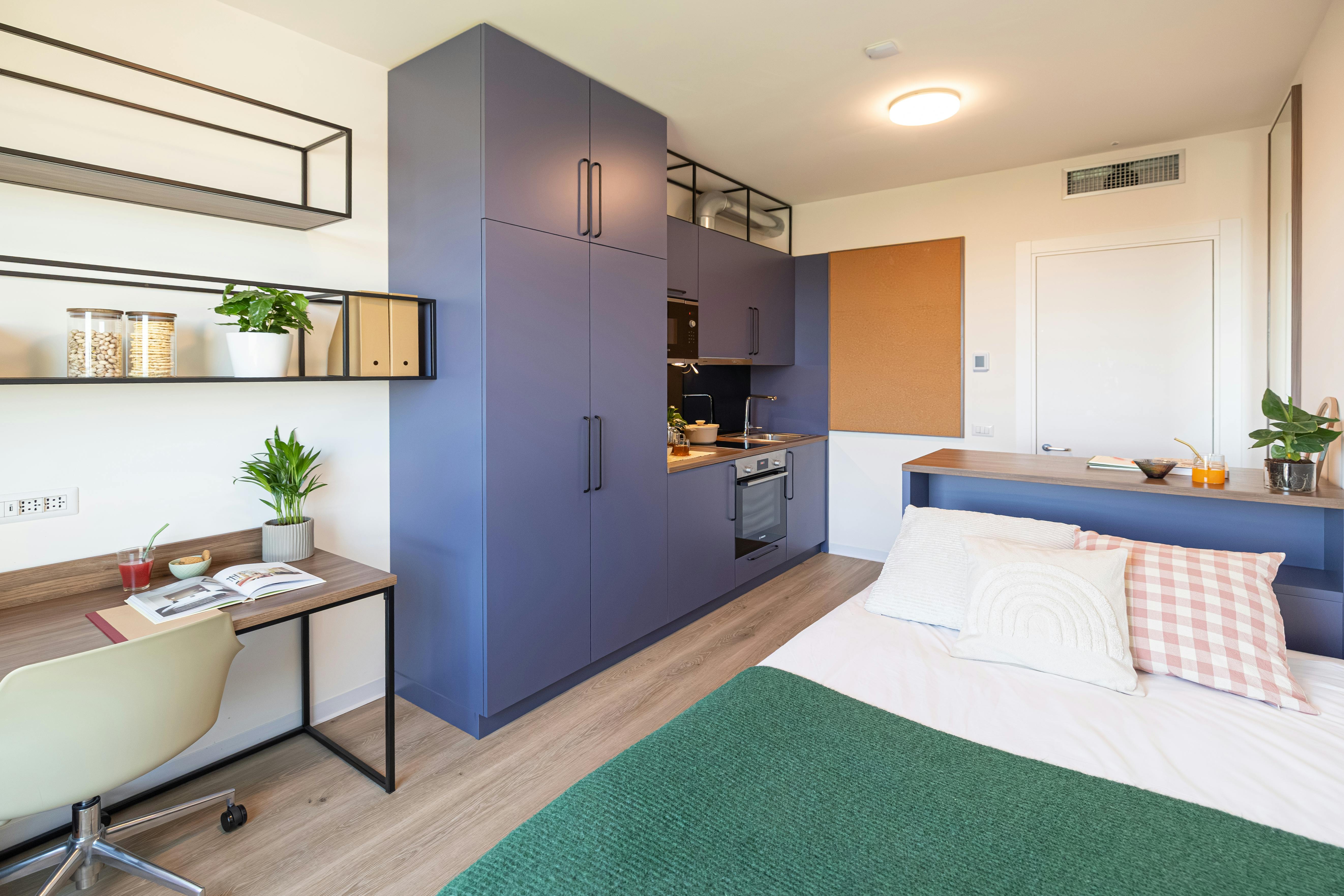 An apartment unit consisting of two studio rooms with private kitchen, each measuring 13 square metres, and a common entrance hall with access to a shared bathroom. Features: - Our most convenient room - Floor: 1st-3rd What will you find in the room? - 120x200 cm bed - Desk with study lamp and swivel chair with upholstered seat - Wardrobe with storage space in the upper part - Dining table with two stools - Fully equipped kitchen with sink, induction hob, electric and microwave oven, refrigerator and crockery cupboards/utensils - Independent heating or cooling adjustable by thermostat - Large bathroom (approx. 4sqm) with shower - Access with electronic KeyCard or smartphone app What will you need to bring? - Bed linen, bathroom accessories and towels - Kitchen accessories (pots and pans for induction hob, cutlery, utensils, plates, chopping boards, dishcloths, etc.) What is included in the price? - Utilities: Electricity, Water, Internet (WiFi + broadband wired) - 24/7 Security - Routine maintenance - Access to indoor gym - Weekly room cleaning Common areas: - gaming area, cinema and music studio - Yoga room, study rooms and reading lounge - Indoor laundry room equipped with Miele Professional 8kg machines: washing (€ 2.50) and drying (€ 2.00)...