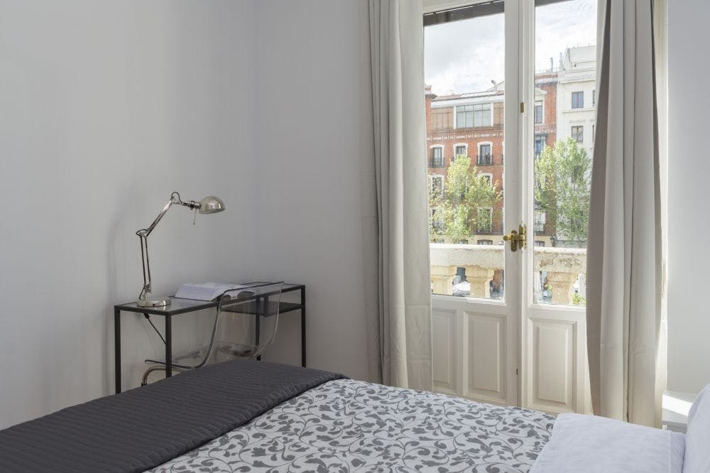 Beautiful flat in Madrid, located in Plaza de Santa Ana Beautiful renovated flat in Madrid , located in the famous Plaza de Santa Ana, in Barrio de las Letras and nearby Puerta del Sol. It is a wonderful place to just sit and watch the touristic and local people, take a refreshing drink at one of the open-air terrace cafes, or to go shopping in Fuencarral street. You can also enjoy the musicals and theaters of Gran Vía, or have a coffee on a terrace coffee before moving on for dinner or to dance. This amazing flat has seven rooms, two complete bathrooms, a fully equipped kitchen, a living room with flat TV and a dining area. It is perfect for young international students and workers who want to be in the city centre with the best transportation connections in Madrid (Sol and Antón Martín metro station and Cercanías station). Don ́t miss this opportunity! The Plaza de Santa Ana, together with the nearby small streets which make up the Huertas district, is one of Madrid's most lively and vibrant areas, with hundreds of tapas bars, terrace cafes, pubs, restaurants and Irish bars all within a relatively small area. The square itself is located just a short walk from both the Plaza Mayor and the Puerta del Sol. It is also possible to walk to Madrid's main museums from here, making this area an ideal location to stay in the city. The area is well served by public transport by having three metro stations that connect you to the various lines of the Madrid metro network: - Metro Antón Martin – línea 1 - Metro Sol – líneas 1, 2 y 3 - Estación de Renfe (cercanías) - It is a wonderful place to just sit and watch the touristic and local people. - Take a refreshing drink at one of the open-air terrace cafes. - Go shopping in Fuencarral street - Enjoy the musicals and theaters of Gran Vía - Take over the terrace coffee before moving on for dinner or to dance away in early hours. - Don't smoke - Pets are not allowed - Parties are forbidden - Take out the trash daily - Short-term visits are allowed - (hidden) informs that in this flat a device has been installed in order to allow the monitoring of the noise level (decibels) 24 hours a day. The system emits an alert whenever the sound level exceeds the maximum allowed by the Community of Madrid, mainly between 11pm and 6am. Wonderful room in Plaza de Santa Ana This wonderful room has a huge balcony with views to one of the most beautiful squares in Madrid, Plaza de Santa Ana. It's fully equipped with a double bed (135 cm), a large built-in wardrobe, a bedside table and a desk with a lamp and a ceiling fan. It's perfect for young workers and students. The size of the room is 12 m2, it has its own lock and central heating. *Bedding is not included, only a matress cover is provided. Please keep in mind that the amount requested in the "other additional costs" field refers to tenant assistance coverage....