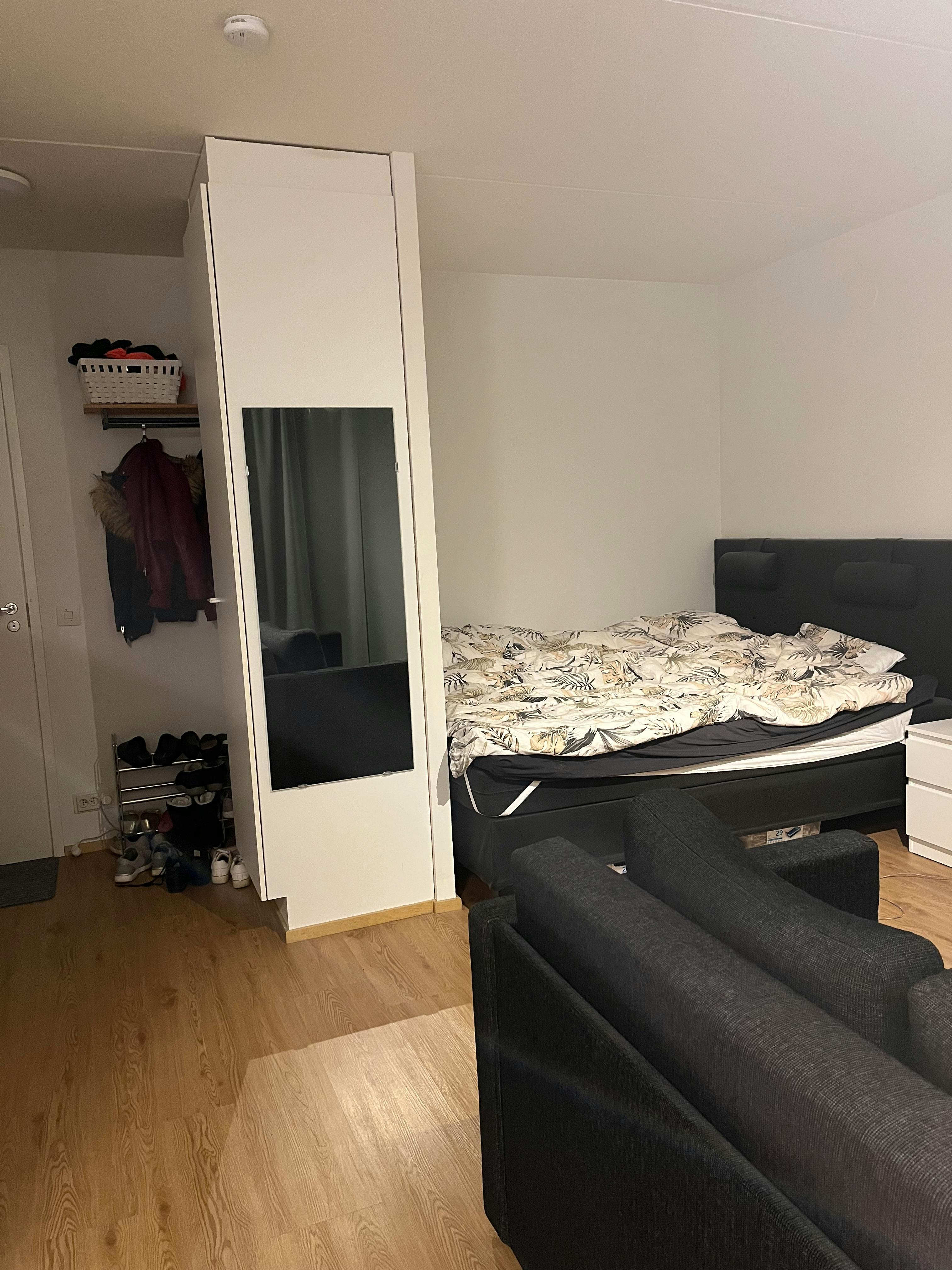 This 1 room furnished 32,5 square meter apartment in Leppävaara, Espoo is for rent from (hidden). The apartment is on the second floor and the apartment has a balcony. Rent fee is 513€ / month + internet (12€ / month) + electricity (25€ / month). Home insurance is needed during the stay. The apartment has double-bed, sofa, TV, shelves, nightstand, closets, mirror, writing desk, chairs and vacuum cleaner. In the kitchen, there are microwave, Dolce Gusto capsule coffee maker, electric kettle, toast maker, cutlery and other kitchen items. There are towels and bed sheets in the apartment. There is a washing machine in the bathroom. On the ground floor, there is possibility to book a washing machine or a tumble dryer time slot from the laundry room. This apartment is suitable for example for an exchange student or an intern who needs the furnished apartment for a limited time. No smoking in the apartment and silence starts at 10 PM so no loud noises in the night, for example no partying and no music to respect neighbours. Near the apartment (approx. 350-500 m) are shopping center, train station and bus stations. For example, to Helsinki center it takes about 10-20 minutes by train and to Aalto University it takes about 10-20 minutes by buses 550 and 555. There are also grocery stores and a health center near the apartment...
