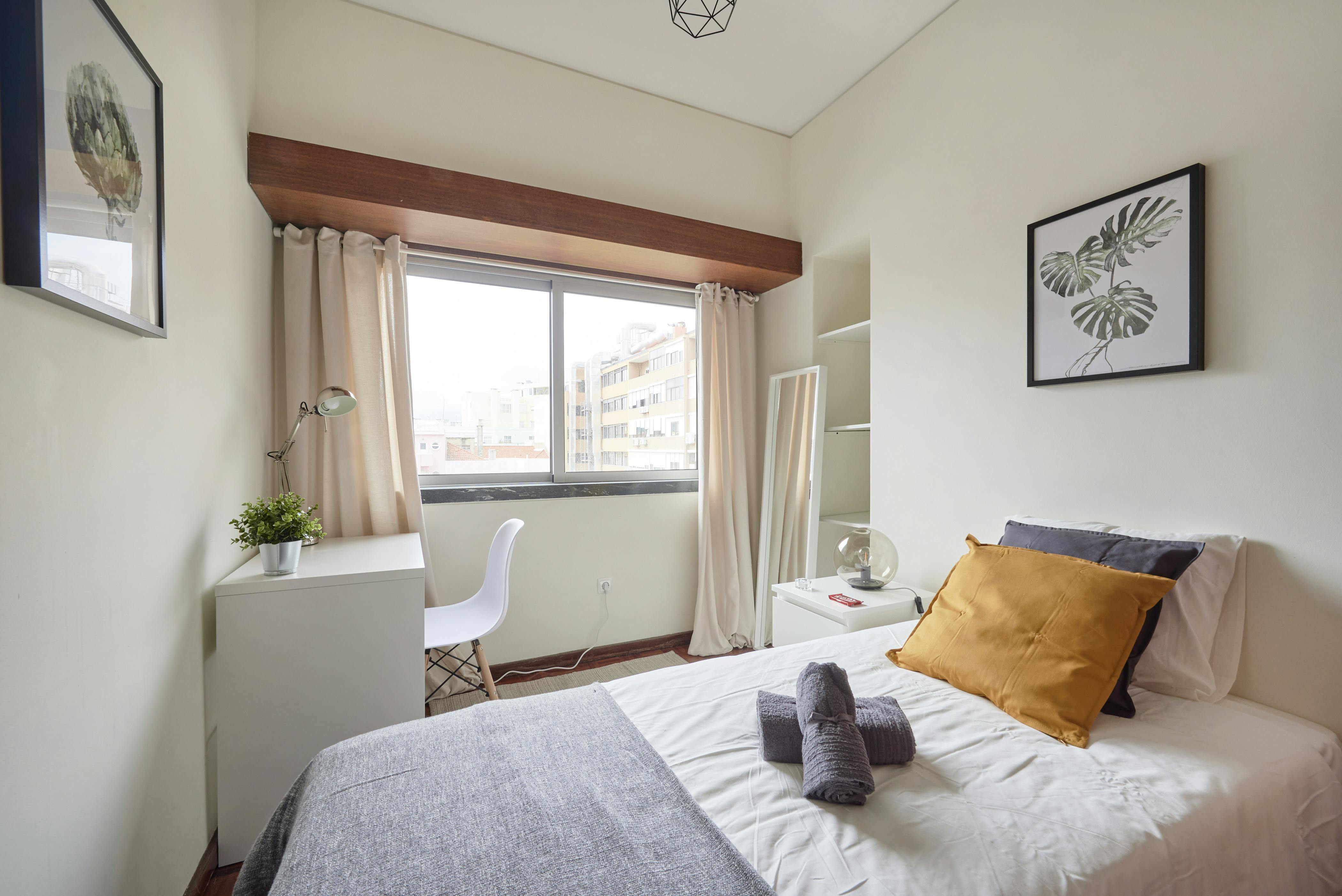 Zone: Rua Visconde Santarém is known for its picturesque architecture and proximity to various restaurants, shops, cafes and even a butcher nearby. The street often attracts both locals and tourists, making it a lively area with a lot to explore which is made easy with its proximity to public transportation. Metro: 3 min walk (450m) Saldanha Bus: 1 min walk (80m) R. Visconde Santarém Train: Not applicable Flat description: 6-bedroom flat on the 4th floor, featuring 3 WCs. The living room comes with a TV and a balcony, while the kitchen fully furnished and comes equipped with a dishwasher and a washing machine. The building includes a lift for convenient access. Room: This charming room is fully furnished and includes a dedicated workspace equipped with a small desk, chair and a lamp. You will also find a built-in wardrobe, a bedside table with an additional lamp and a mirror. The comfortable single bed measures 90 cm wide by 200 cm long, ensuring a restful night's sleep. As a disclaimer we would like to inform you that the flat comes furnished as shown in pictures or with equivalent replacements. Others: - The rent includes 35€/per person of included bills (extras will be deducted from the security deposit). - A weekly cleaning of the common areas is also included in the rent. - We offer bed sheets and towels just as shown in the pictures. - The rooms come as shown in the pictures or with an equivalent replacement. - The rooms are for individual use, except if we have a previous agreement. - Visits are allowed, but they need to be communicated and approved in a timely manner. - All check-ins are done in person, require ID and the security deposit paid. - Check-ins are possible from Monday to Friday 9am – 5:30pm. Weekends & public holidays may be possible with a 20 euros charge per person. - We do not allow smoking or pets in the flat. - Mandatory fee: The amount of €55 for a single bed or €65 for a double bed will be deducted from the security deposit, which corresponds to the basic linen kit that includes: sheets, pillowcases and towels. This kit can be taken by the guest at the end of their stay....