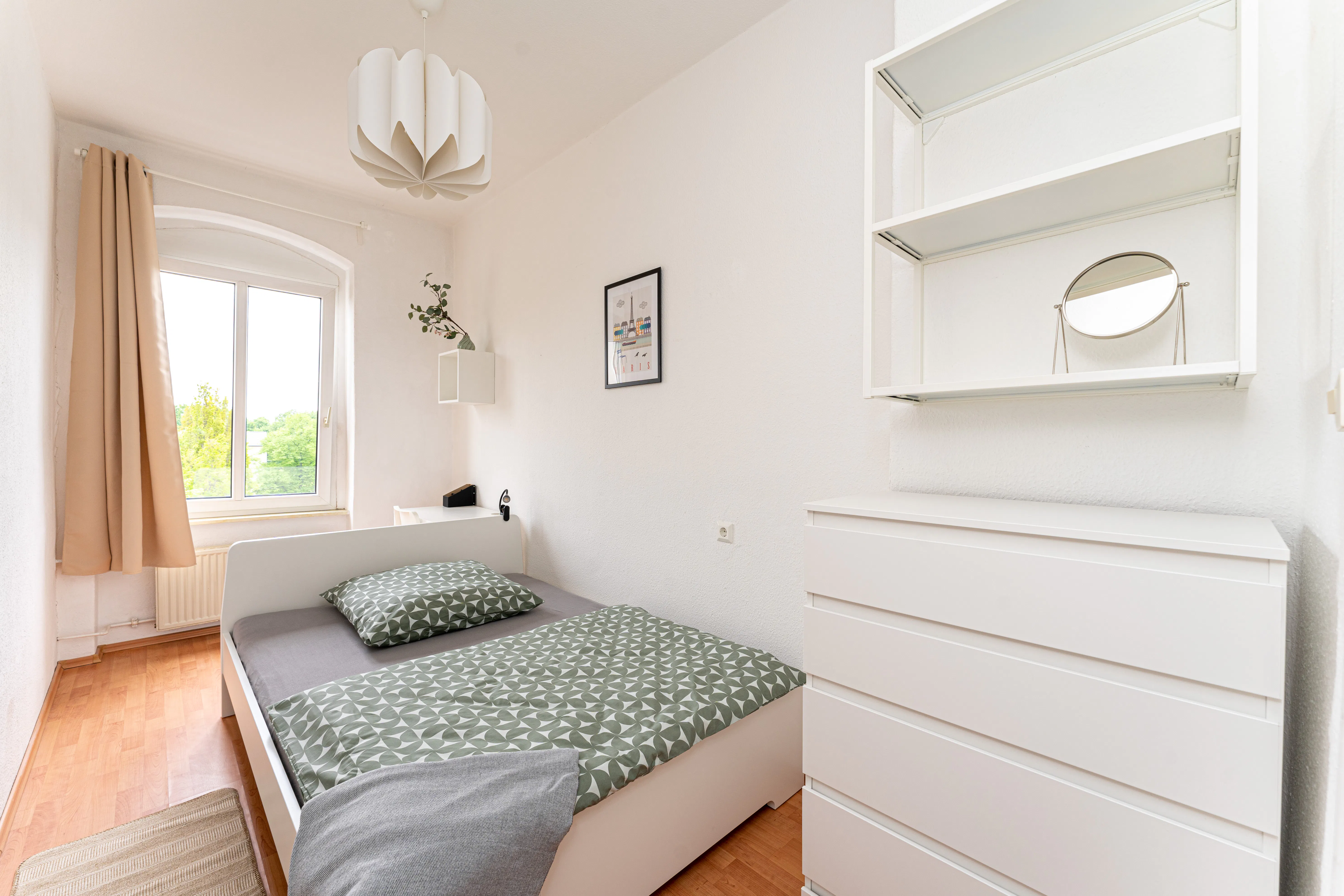 Room 5 Hi Guys, this is a fully furnished room in a shared flat. The room has a comfortable bed, a desk with chair and a wardrobe for your clothes. Also the common areas are fully equipped with washing machine, cooking equipment and all you need for your daily living. Anmeldung/Registration is possible. The monthly rent price is all inclusive (rent + heating + water + Internet + GEZ/german TV license fee). For the move in dates we have only the 1st or the 16th of each month a tenant can move in. In specific cases we have a flexible move in date, but this needs to discuss in our messages. plus the deposit of 950€, which needs to be payed before move in via bank transfer in a single payment....