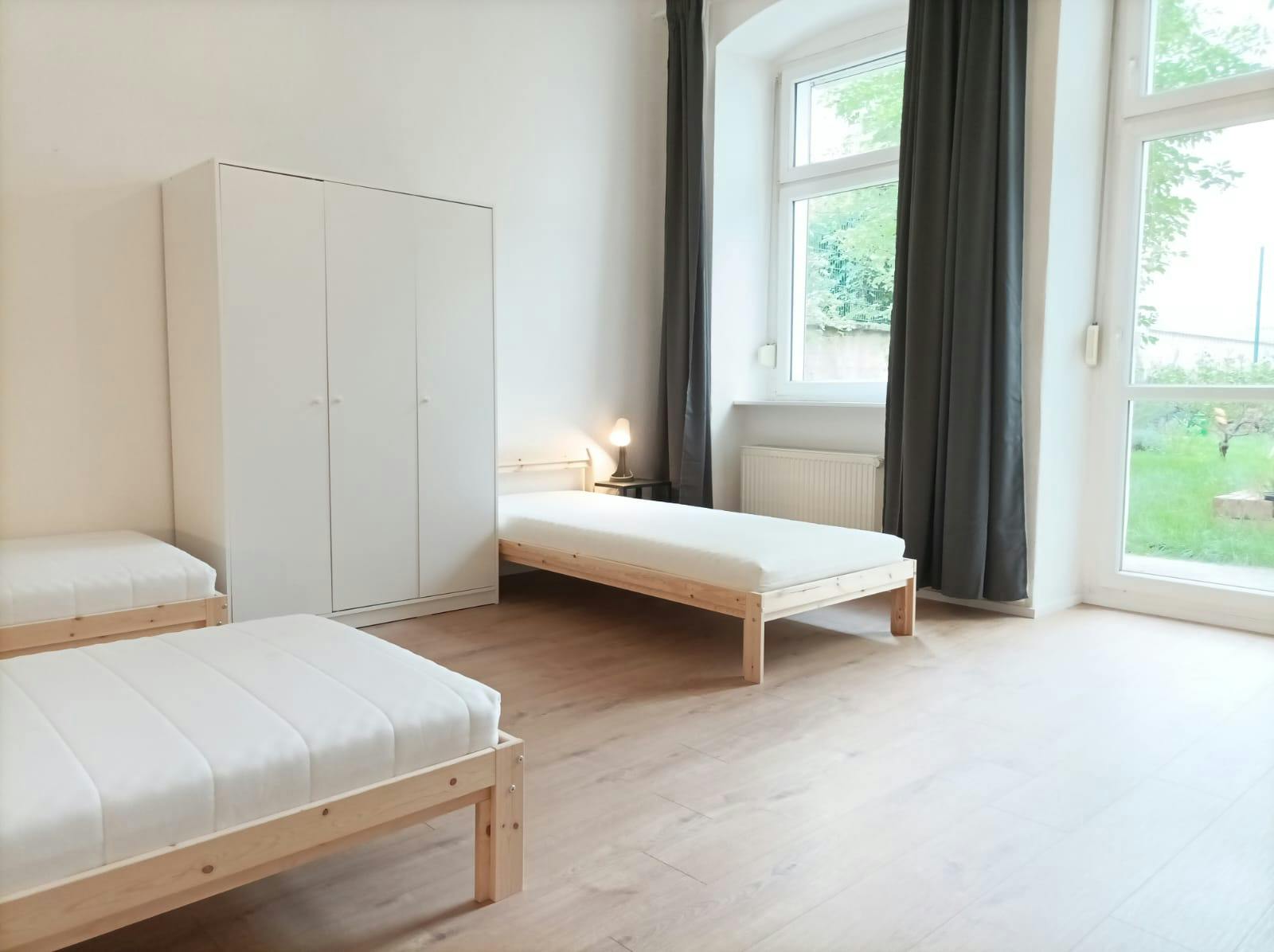 2 Rooms • 95 sqm • Ground floor • Prenzlauer Berg • Driesener Strasse Minimum stay: 7 months • Maximum stay: 12 months • Anmeldung is provided Suitable for: Roommates / 1 - 6 People Room 1 3 Single beds 90X200 3 night tables 3 reading lamps 3 Wardrobes Mirror Dining table Chairs Curtains Blackout curtains Room 2 3 Single beds 90X200 3 night tables 3 reading lamps 3 Wardrobes Mirror Dining table Chairs Curtains Blackout curtains Kitchen Fridge Oven Electric stove Hood Microwave Toaster Kettle Dishwasher Dining table Chairs Bathroom Washing machine Bathtub Shelf Towel racks Mirror Hall Mirror Hangers Bank Shoe rack Shelf Amenities WiFi Laminat floor Gas heating Clothes drying rack Clothes hangers Vacuum cleaner Cleaning tools Plates/glasses/cutlery Pots and pans Cooking equipment Public transport 5 minutes walk to Tram station (50/M1/M2/M13) 7 minutes walk to S+U Bahn station Schönhauser Allee (U2/S41/S42/S8/S85) 8 minutes walk to S-Bahn station Bornholmer Straße (S1/S2/S8/S25/S26/S85) Supermarkets 3 minutes walk to REWE Requirements Documents needed: Copy of passport Proof of income/financial support Studies admission Pets: not allowed Smoking: not allowed Included Electricity Heating Water Gas Wi-Fi If the utility consumption exceeds the cap amounts, the tenants will have to pay the extra costs Excluded One time fee: Administrative fee: €250 + 19% VAT (to be paid after moving in) Final cleaning fee: €300 + 19% VAT (to be paid after moving in) Monthly: Cleaning fee: €75 (to be paid to the cleaning person) Broadcasting fee: €18.36 (to be paid to ARD) All payments are for all tenants togethe...