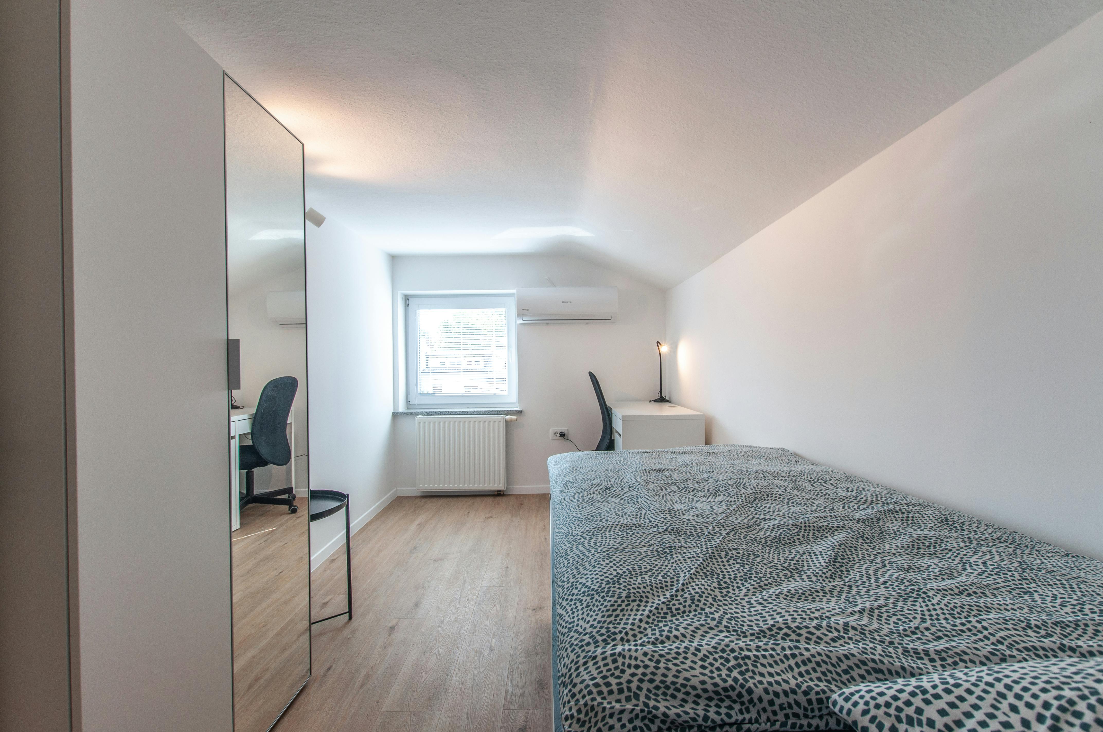 After a massive success with our first Tesla house, this year we decided to open a brand new Erasmus student dorm house only a few blocks away from Tesla house and in a mile radius there are more than few major universities. There is a convenience store close by and a bit further even a big shopping mall. The main city bus line and bus stop is on the same street as the house, so you will have no trouble getting around. This house has 3 floors with 24 cozy and bright (fully furnished) rooms, 3 fully equipped kitchens with dining and socialising areas one on each floor, plenty of bathrooms and toilets and even a jacuzzi. The house has a massive private garden with lots of greenery for barbeque or sunbathing and even a big terrace to enjoy morning coffee in the sun or maybe evening drinks with housemates. All the floors are accessible to all residents by the main staircase and so all the amenities are at your disposal, allthought each floor is a self sufficient unit with everything one might need for a comfortable living. For more detailed description of each floor take a look at our rooms description with pictures. Be the first for this first semester this year to experience the comfort of our brand new house so hurry up and make your reservation today. Second Floor: On the second floor there is a fully equipped kitchen with refrigerator/freezer, dishwasher, microwave, oven and of course plenty of storage space for kitchen items and food. There is separate dining area with tables and chairs and some more storage space for various items. There is a bathroom with shower and a washing machine. On the second floor there are six single bed rooms altogether. Although the floor is basically self sufficient all other amenities across the house are at residents disposal as well, and are accessible by staircase connecting all three floors. Room 19 is a bright, single bed bedroom on the second floor of the house. It has approx 9 m2 of floor surface. It is fully furnished with a single bed, closet, desk with light, chair and a night stand with light. It has a window facing entrance to the yard. This room has also air conditioning. Important notice! Standing height in the third floor is 205 cm. If you are very tall, then please choose another room on the ground or first floor...