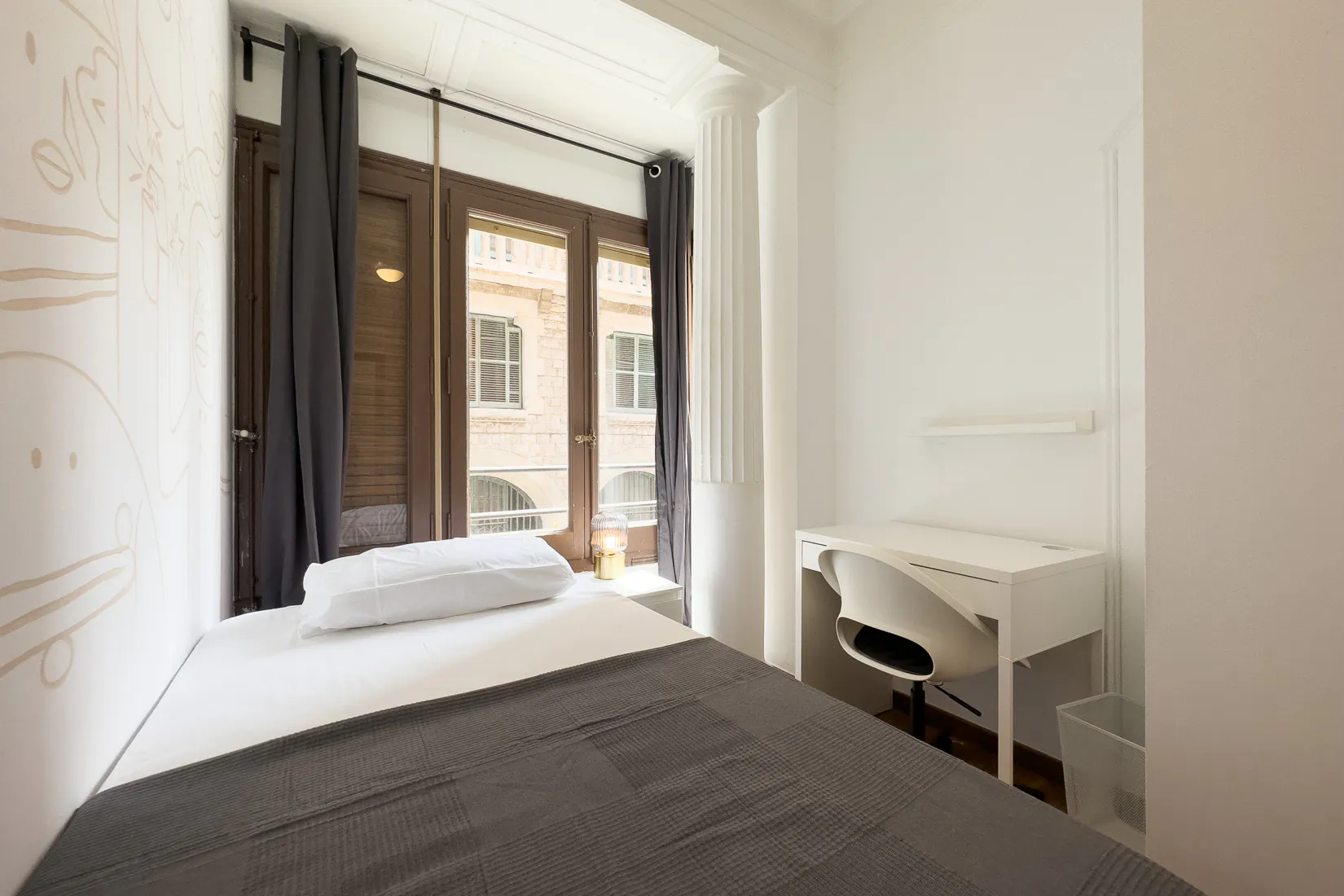 HABITACIÓN INDIVIDUAL La habitación cuenta con cama individual, zona de escritorio y armario. El apartamento cuenta con cocina completamente equipada y los dos baños serán compartidos por un máximo de 7 personas. Nuestro coliving está enfocado a estudiantes y jóvenes profesionales, generalmente entre 18 y 40 años, y ambiente internacional. Buscamos que disfrutes de Barcelona y que tu estancia sea cómoda, por lo que nuestros asesores te ayudaran ante cualquier duda. Al hacer tu reserva queremos que disfrutes con nosotros, estés cómodo y cuentes con nuestro equipo y comunidad, por ello no solo te ofrecemos un alquiler, sino que alojándote con nosotros: - Formarás parte de nuestra comunidad, teniendo acceso a eventos y actividades semanales para que descubras Barcelona y te sientas como en casa siendo uno más. - Limpieza semanal de las zonas comunes - Servicio de mantenimiento - Posibilidad de empadronamiento (City registration) para estancias a partir de 6 meses - Servicio Medico 24/7 por Quirón Salud - Atención al cliente 24/7 a través de nuestro departamento de Atención al coliver - Invitación a eventos y actividades especiales Condiciones: - Un mes de Fianza - Membership Club - Suministros incluidos en el precio como electricidad, agua, calefacción y internet de alta velocidad (hasta un máximo de 70€ ) - Consultar estancia mínima - De documentación únicamente solicitamos DNI o pasaporte Nuestro coliving está enfocado a estudiantes y jóvenes profesionales que quieren disfrutar de una estancia en Barcelona. La ubicación es inmejorable en la zona de Sant Pere - Santa Caterina i la Ribera, Ciutat Vella. Bien comunicado, muy próximo a la parada de metro Urquinaona, igualmente, a pocos metros de la plaza de Catalunya, catedral de barcelona y paseo de las ramblas. Además, cuenta con todos los servicios necesarios en los alrededores: restaurantes, tiendas, supermercados, bancos, farmacias. Check-in: Lunes: 15:00 - 21:00 Martes - Viernes: 15:00 - 22:00 Sábado: 15:00 - 18:00 Domingo/Festivos: el check-in es posible con previo aviso y coordinación. 📅 CONTRATO QUINCENAL En el mes de entrada o de salida: - Si te quedas 14 días o menos, pagarás la mitad del alquiler de ese mes. - Si te quedas más de 14 días, pagarás el alquiler del mes completo. (El importe a pagar de cada mes aparece calculado en el resumen de pagos)...