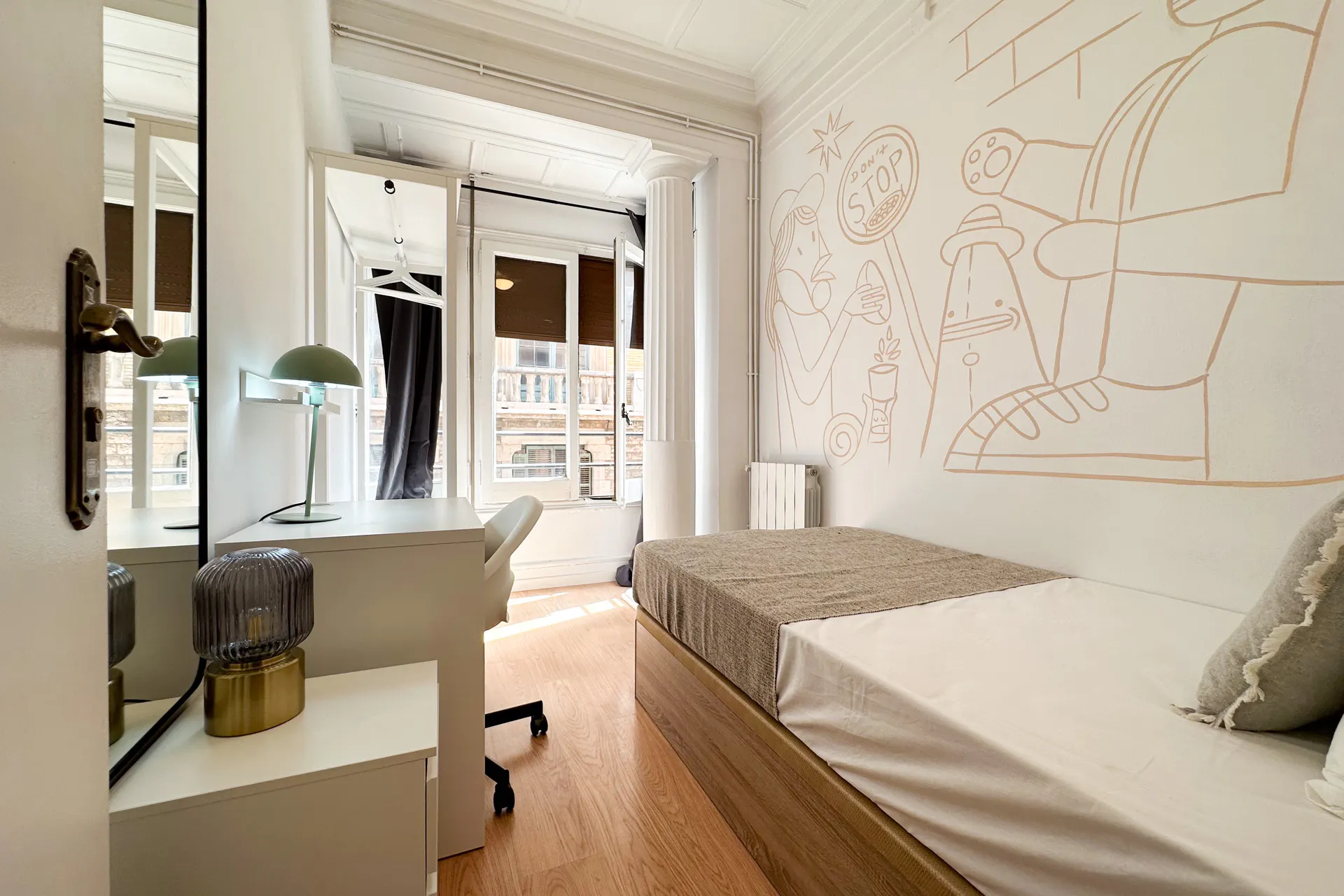 HABITACIÓN INDIVIDUAL La habitación cuenta con cama individual, zona de escritorio y armario. El apartamento cuenta con cocina completamente equipada y los dos baños serán compartidos por un máximo de 7 personas. Nuestro coliving está enfocado a estudiantes y jóvenes profesionales, generalmente entre 18 y 40 años, y ambiente internacional. Buscamos que disfrutes de Barcelona y que tu estancia sea cómoda, por lo que nuestros asesores te ayudaran ante cualquier duda. Al hacer tu reserva queremos que disfrutes con nosotros, estés cómodo y cuentes con nuestro equipo y comunidad, por ello no solo te ofrecemos un alquiler, sino que alojándote con nosotros: - Formarás parte de nuestra comunidad, teniendo acceso a eventos y actividades semanales para que descubras Barcelona y te sientas como en casa siendo uno más. - Limpieza semanal de las zonas comunes - Servicio de mantenimiento - Posibilidad de empadronamiento (City registration) para estancias a partir de 6 meses - Servicio Medico 24/7 por Quirón Salud - Atención al cliente 24/7 a través de nuestro departamento de Atención al coliver - Invitación a eventos y actividades especiales Condiciones: - Un mes de Fianza - Membership Club - Suministros incluidos en el precio como electricidad, agua, calefacción y internet de alta velocidad (hasta un máximo de 70€ ) - Consultar estancia mínima - De documentación únicamente solicitamos DNI o pasaporte Nuestro coliving está enfocado a estudiantes y jóvenes profesionales que quieren disfrutar de una estancia en Barcelona. La ubicación es inmejorable en la zona de Sant Pere - Santa Caterina i la Ribera, Ciutat Vella. Bien comunicado, muy próximo a la parada de metro Urquinaona, igualmente, a pocos metros de la plaza de Catalunya, catedral de barcelona y paseo de las ramblas. Además, cuenta con todos los servicios necesarios en los alrededores: restaurantes, tiendas, supermercados, bancos, farmacias. Check-in: Lunes: 15:00 - 21:00 Martes - Viernes: 15:00 - 22:00 Sábado: 15:00 - 18:00 Domingo/Festivos: el check-in es posible con previo aviso y coordinación. 📅 CONTRATO QUINCENAL En el mes de entrada o de salida: - Si te quedas 14 días o menos, pagarás la mitad del alquiler de ese mes. - Si te quedas más de 14 días, pagarás el alquiler del mes completo. (El importe a pagar de cada mes aparece calculado en el resumen de pagos) 💵 Payments before the check-in: Once the reservation is confirmed, you will be required to make the additional payments (security deposit, etc.) through our secure payment system before the move-in date...
