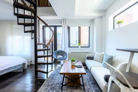 This renovated, fully furnished Duplex offers modern comfort in a quiet setting. Featuring a fully equipped kitchen, in-unit washer-dryer combo, heating, AC, and fresh towels, it’s designed for convenience. Large windows and a private balcony bring in natural light, while its rear-facing location ensures peace and quiet. Situated in an elevator building with only two apartments per floor, the unit offers privacy and secure smart lock access. Perfect for business or leisure travelers, it’s just moments from top dining, entertainment, and transit options. Move-in ready—just bring your suitcase! Experience the ultimate in modern luxury with this spacious and inviting studio apartment located in prime midtown west. Perfect for both work and pleasure, this location offers easy access to everything the city has to offer, including museums, great cafes, delis, restaurants, gyms, bars, and pubs. Plus, you'll be steps away from Central Park, 9th avenue's wide variety of restaurants, Rockefeller Center, Times Square, Broadway theaters, 5th avenue prime shopping, Time Warner Mall, and the culture-packed Lincoln Center. The Space: This beautifully renovated, fully furnished duplex junior 2-bedroom apartment offers a quiet and stylish retreat in the heart of Hell’s Kitchen,. Featuring modern furnitures, a fully equipped kitchen, in-unit washer-dryer combo, high-speed WiFi, heating, and air conditioning, it ensures a seamless stay. With large windows and a private balcony and Private Terrace, the space filled with natural light while facing the back of the building south and west exposure for added tranquility. Located in an elevator building with only two apartments per floor, privacy is a priority. Secure smart lock and code access provide convenience and safety. Perfect for business and leisure travelers, this prime location is steps from top dining, entertainment, and transportation. Move-in ready—just bring your suitcase! Guest Access: Smart-Lock keyless access to the building and apartment. The Neighborhood: Located in the heart of Hell's Kitchen, this bustling neighborhood in Midtown Manhattan is known for its lively atmosphere, diverse food scene, and proximity to some of the city's top attractions. This area is a hub for theater and entertainment, with numerous Broadway theaters, comedy clubs, and music venues within walking distance. The nearby Hudson River Park provides a beautiful waterfront escape for running, biking, and outdoor activities, and the High Line elevated park is just a short walk away. The neighborhood is also known for its excellent dining options, with everything from casual cafes and bars to high-end restaurants serving cuisine from around the world. Additionally, this area is conveniently located near public transportation, making it easy to get anywhere in the city. Overall, Hell's Kitchen is a vibrant and exciting area with something for everyone, and it's the perfect place to experience the best of New York City...