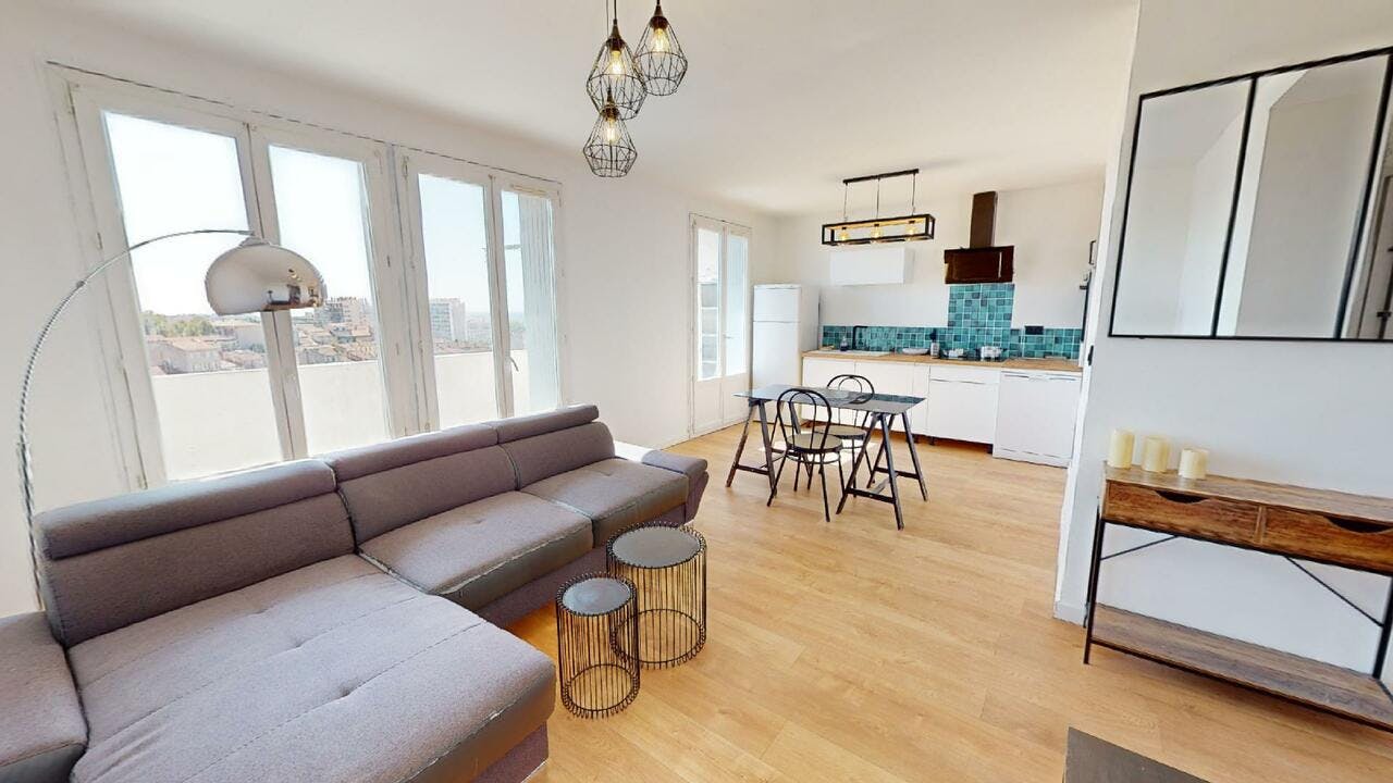 APPARTEMENT 3 PIÈCES AVEC BALCON Venez découvrir au 7 square velten dans la commune de Marseille (hidden) pièces de 55 m2. L'APPARTEMENT Cet appartement s'organise comme suit : un salon équipé d'un canapé, d'un fauteuil, d'une table à manger ainsi que d'une télévision, une chambre, une cuisine et une salle de bains avec baignoire et douche. La chambre est équipée d'un bureau, d'un canapé, d'un lit, d'une penderie et d'un placard. Dans la cuisine, il y a un meuble de rangement. Elle comporte aussi un four, un lave-vaisselle, une machine à café, un micro-ondes et une plaque de cuisson. Le chauffage est collectif. Cet appartement est situé au 9e étage d'un immeuble avec ascenseur. LES EXTÉRIEURS Une cave est associée à cet appartement. Jouissez d'encore plus d'espace grâce à un balcon. LE QUARTIER Il y a l'Aix-Marseille Université et l'École centrale de Marseille à moins de 10 minutes en voiture. Niveau transports en commun, on trouve 10 lignes de bus ainsi que la ligne de métro M1 (Chartreux) à moins de 10 minutes à pied. Quatre autoroutes sont accessibles à moins de 4 km. Pour vos loisirs, vous pourrez compter sur un théâtre à quelques minutes. Il y a également des restaurants, des commerces, des boulangeries, trois supermarchés, deux bureaux de poste et des boucheries...