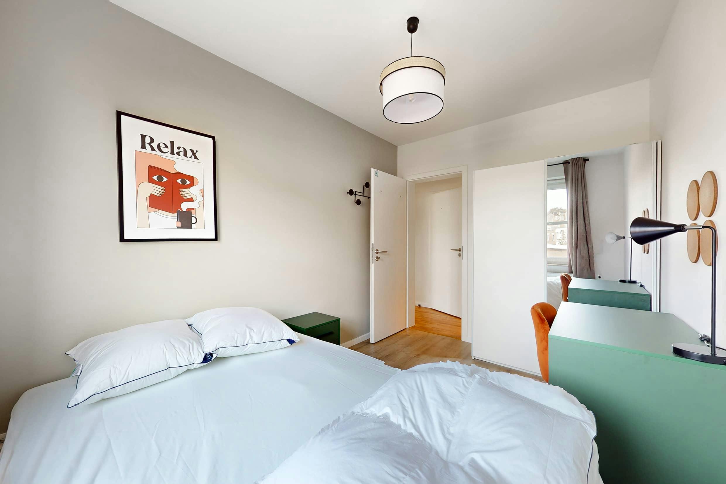 Discover a charming private room in our beautifully renovated flatshare in Jette, Brussels. Perfectly suited for students, interns, or professionals seeking comfort and convenience, this spacious and well-furnished room is part of a modern, contemporary-style apartment that offers a friendly and vibrant living environment. Situated in the vibrant neighborhood of Bruxelles Warland, you'll find everything you need within walking distance. Enjoy a variety of local restaurants, a bakery just 2 minutes away, and a supermarket only 3 minutes from your door. Commuting is effortless with nearby public transportation options, including Pannenhuis (M6) just 2 minutes away and Odon Warland (T51) accessible within 9 minutes. The residence itself boasts a generous 180 m2 shared space that includes a fully equipped kitchen, a bright and spacious living room with a large sofa, smart TV, and a large dining table—ideal for social gatherings or relaxing evenings. There’s also a lovely terrace where you can unwind outdoors. All utility costs, including water, electricity, heating, internet, and building maintenance, are included, ensuring a hassle-free living experience. Your private room provides high-quality bedding (140x200cm), a wardrobe, a desk with a dedicated workspace—perfect for study or remote work—and essential furnishings like a bedside lamp and coat stand. You will share a modern bathroom with other tenants, creating a community atmosphere. Experience comfortable, practical living in a cheerful setting with excellent amenities and accessibility. Book your room today and become part of this welcoming community in Jette...