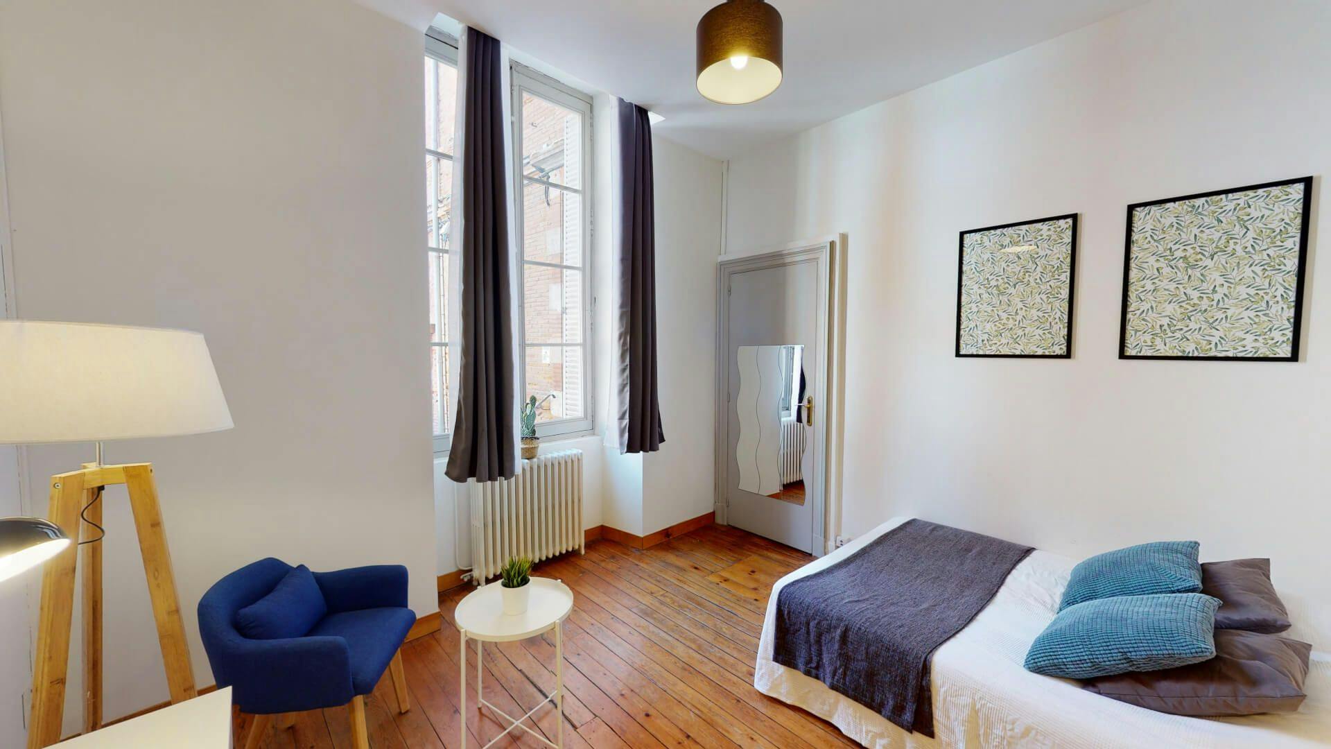 Furnished flat share ! All our flats are located in the city centre and close to all amenities and public transport (Metro, Tramway and Bus). This lovely private bedroom in a fully equipped, furnished and all-inclusive flatshare in Toulouse is a mix of comfort and design. It has got household furnishings, including a bed with pillows and duvet What is missing is your things to feel at home! The room can be locked if you need intimacy. All our rooms are fully furnished (bed, desk, wardrobe, duvet, pillows...). The flatshare is ideally located in the "Capitole" neighborhood, in the centre of Toulouse. A lot of public transports, restaurants, shops are located near at hand. The apartment is on floor #1 . It is entirely furnished and is composed of a large kitchen with refrigerator, kettle, microwave, crockery, toaster, kitchen ustensils, pans... The accommodation also contains a clothes rack, a washing machine, an ironing board, an iron. Additionally, you will find cleaning items in the flatshare: dustpan and brush, mop and bucket, broom, bagless hoover... Every furnished flatshare includes all bills: unlimited wi-fi, housing insurance, electricity, water, household waste tax, condominium fees. All our flats are fully equipped (washing machine, dishes, decoration...) by our teams, who also take care of the technical and material maintenance. Want to know more about the Capitol neighbourhood? This lovely room in an all-inclusive flatshare is located in one of the liveliest neighbourhoods in Toulouse! The Capitol neighbourhood is the historical centre of the Pink’s city. It develops around the Capitol square, which has given it its name. Capitol Square is a place for the Toulousians to come together, share and enjoy their lives during major events. We find here the Capitol – an ancient and majestic building which is today the city hall of Toulouse. The Capitol Theatre abuts on this square as well. This historical building was inaugurated in the 19th century and it is devoted to ballet and lyric art. At the edge of the River Garonne, close to the Carmes neighbourhood, Capitol neighbourhood is simultaneously one of the smallest and richest neighbourhoods in Toulouse. Plenty of Museums and historical buildings are located here such as the Musée du Vieux Toulouse, the Musée des Augustins but also the Basilique Notre-Dame de la Daurade and the Basilique Saint-Sernin de Toulouse. The area is very well-connected by public transportations and counts an endless number of bars, restaurants and shops as well as prestigous universities such as the Toulouse Law School (University Toulouse 1 Capitol) Minimum stay : 1 mois Apartment eligible for CAF up to 258€ / month. The CAF for Caisse d'allocations familiales is a free public service eligible for all, including foreigners and can help you financially to pay part of your housing according to your situation whether you are French or foreign. To find out the potential amount of your assistance, go to the CAF website and complete the online APL (housing assistance) estimate. Service fee : from 490€ The service fee covers the writing of the lease but also the assistance throughout your stay. The service fee covers the repair and maintenance of the equipment as well as access to our ultra-reactive support in case of need for intervention in your accommodation. Deposit : 700...