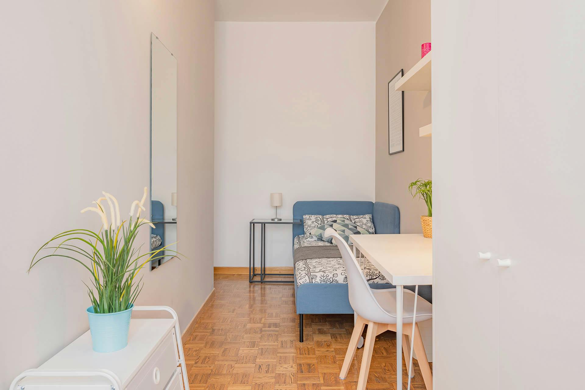 The apartment of via Pollak 10 is a multi-room apartment shared for university students, interns or young workers that consists of a large entrance hall, 5 private bedrooms, kitchen and 2 bathrooms. The flat is almost 120 squared meters and located at the third floor of a residential building. Via Pollak is close to via Novara, San Siro district, which is connected through via rembrandt to the city center of Milan (De Angeli district). The street is very well served with pubblic transportation: a few hundred meters far from bus station of the lines 64, 78, 80, 423 and less than 1 km far from the metro stations of the Purple line M5 San Siro Stadio and San Siro Ippodromo. The area is served with any kind of services: right next to the building there is Esselunga supermarket, while in via Novara there are shops, bars, restaurants and take-aways. In an apartment located in via Pollak 10, this private room is reserved foruniversity students, interns or young workers. Fully furnished, it is equipped with single bed, bedside table with lamp, wardrobe, bookcase, desk and chair. Kitchen and bathrooms are shared with the other tenants of the apartment. Includes utilities: building expenses, heating, water, electricity, internet, garbage tax, periodical cleaning services of common areas; utilities adjustments excluded. RENTAL CONDITIONS: -BI-WEEKLY CONTRACT: If you move in during the 2nd half of the month, you will only pay half-a-month’s rent for that month. If you move out during the 1st half of the month, you will only pay half-a-month’s rent for that month. I always rent from the first day the room is available. - ALL - INCLUSIVE Monthly rent: water, gas, electricity, wi-fi, condominium fee all included! - DEPOSIT that it will be given back to you at the end of your stay. - CONTRACT REGISTRATION (one time fee): depending on the room you are interested in. Please check the field OTHER to see this fee. - ONE TIME ADMIN FEE: We are a professional property management company and for this reason we also include initial and final cleaning of the room; cleaning of common area of the flat every two weeks; 2 bed-linen; contract activation and termination: professional assistance service and property maintenance during your stay: we will take care of everything! Do you want to finish your contract earlier than agreed? Don’t worry, please inform us and if you find a substitute (of course we can also help you!), you can leave without any type of penalties. Please be aware that HousingAnywhere is an online booking platform. Therefore exchanging contact details and offering viewings is not possible. If you would like to reserve this accommodation, send me a booking request or a message and please mention your age and occupation....