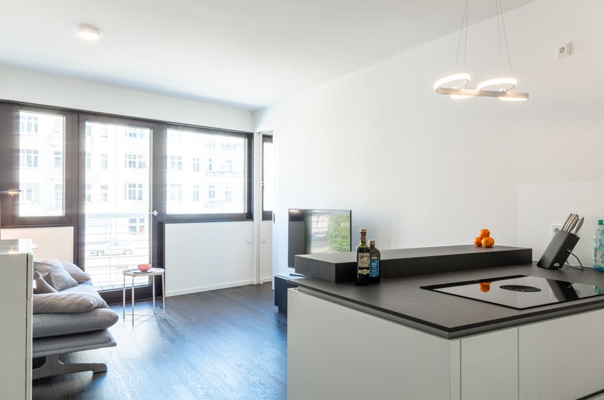 The prestigious property WAVE Waterside Living stands out with its distinctive architecture and elegance. The wave-shaped buildings were designed by the renowned architect from GRAFT, resembling a luxurious cruise ship. The futuristic (minimalistic) design extends from the façade through the entire building into the interior. The WAVE Waterside Living project has received multiple awards, such as the German Design Award in 2019 and the Best Residential Development award in 2020. The perfect location directly on the river Spree is another highlight of this property. In addition, every tenant has access to a large community rooftop terrace, which provides a fantastic view over Berlin. As a tenant of this apartment, you'll find your own urban oasis in the heart of the city with breathtaking panoramic views of Berlin's highlights, including the Spree river, the Badeschiff, the Oberbaum Bridge, or the famous Molecule Men. Tenants also have access to a private boat dock. FURNISHING This 2-bedroom apartment is high-end and features elegant design. The living and dining area, as well as the bedroom, are adorned with high-quality dark parquet flooring. The living room opens onto a small balcony. The luxurious bathroom is accessible from the bedroom, and the standout feature here is the designer shower. The entire apartment can be controlled using the integrated Smart Home System, making it an ideal urban residence. This luxurious property boasts the following features: + Prime location right on the banks of the Spree river + Luxurious built-in kitchen + High-quality materials + Minimalistic design + Desirable residential area with excellent access to S-Bahn and U-Bahn + Integrated Smart Home System + Private boat dock for tenants + Spacious community rooftop terrace with a view over Berlin + Sun protection: External blinds, electronically controlled LOCATION Situated in one of Berlin's most popular areas, you'll be living at the heart of the city. Right on of the Spree River and in close proximity to numerous clubs, bars, restaurants, and more. The iconic Oberbaum Bridge and the East Side Gallery are just around the corner, as is the Mercedes-Benz Arena. Numerous companies like Coca Cola, Zalando, Universal, and many others are in the immediate vicinity. Public transportation, including U-Bahn, S-Bahn, bus lines, and the Deutsche Bahn, are just a few minutes away at stations like Warschauer Straße, Treptower Park, and Ostkreuz...