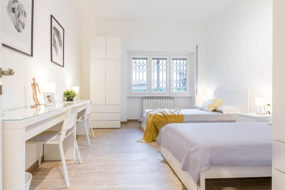 Beautiful three-room flat with 2 bedrooms in Milan, few meters away from the red line metro Inganni A beautiful building in the heart of the Inganni district houses one of our finest flats. Located in a quiet residential area, the neighborhood offers all the amenities you may need: supermarkets, shops, and the red metro line, which provides direct access to Milan city center and all the main university areas. Just ten minutes by metro is Fiera di Milano, hosting international events every year. The recently renovated flat features a bright and cozy living area with TV, perfect for dining and entertaining, a fully equipped kitchen, two double bedrooms, and a bathroom with shower. The flat is located in the heart of the Inganni district, just a few minutes' walk from the Inganni red metro line, which makes it easy to reach Milan's main university centres: - Il Sole 24ore Business School: 20 minutes by metro, red line Lotto; - Brera Academy of Fine Arts: 25 minutes by metro, red line Cairoli; The area counts several supermarkets and shops for any need. The strategic location will let you to enjoy the many activities that Milan offers. You will be able to explore the city not only by walk but also thanks to an incredible transportation network: - Metro, red line Inganni 5 minutes walk. You can easily reach the city centre (Cadorna-Cairoli-Duomo); - Bus line 58. Milan, the Italian fashion capital, is the new trendy destination in Europe, due to its historical heritage, gastronomy and visionary designers. Grand elegant palaces, tree-lined boulevards and avant-garde boutiques make the city truly unique. You will find not only many restaurants and nightclubs that liven up Milan all year round, but also enchanting historical monuments such as: Duomo, Castello Sforzesco, Quadrilatero della Moda, Galleria Vittorio Emanuele, Palazzo Reale and Cenacolo Vinciano. - Don't smoke - Pets are not allowed - Parties are forbidden - Take out the trash daily - Short-term visits are allowed Bright and big double room in Via delle Genziane This spacious and bright double room in Via delle Genziane is furnished with two single beds storage drawers, two desks, two bedside tables with lamps and two large double wardrobes with internal drawers. An ideal solution for international university students and young professionals! ALL BILLS ARE INCLUDED up to 50 euro of expenses per month (if you will do a normal amount of usage, you would not have to pay for it!). After the payment of the first month rent on HousingAnywhere, to finalize the reservation, the tenant has to pay the deposit and the admin fee. The admin fee covers: -weekly cleaning service of the common areas for the entire duration of the contract; - contract registration fees (registration tax, stamps and registration fee); -maintenance. Contracts can’t end on 30 of April - 31 of May - 30 of June. Cancelling contract in advance is possible with three months notice period only after three months contract. If you cancel the contract before the natural ending you have to pay 200€ penalty...