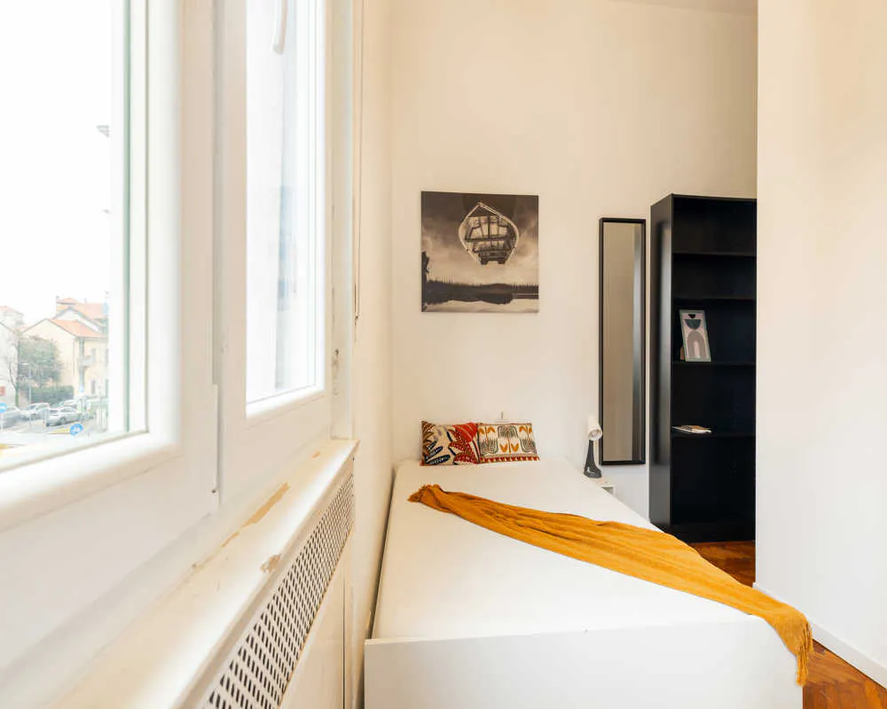 Single room in a shared apartment, composed by 5 bedrooms and 2 bathrooms. Of about 14 sqm with a one and a half bed and a work station. With wifi, dishwasher, washing machine. Energy class: F, IPE 141.46 Kwh/Sqm year. Current tenants: 5: 25, Male, Student Please be aware that HousingAnywhere is an online booking platform. Therefore exchanging contact details and offering viewings is not possible. If you would like to reserve this accommodation, send me a booking request or a message and please mention your age and occupation. I look forward to talking to you! CONTRACT Please, note that to all our listings we apply fortnightly contracts. This means that If you check-in during the first half of the month, you will be charged for the full month. If you check-in during the second half of the month, you will only be charged for the second half. The second half of the month starts on the 16th. If you check-out during the first half of the month, you will only pay until the 15th of that month. If you check-out during the second half of the month, you will be charged the full month....
