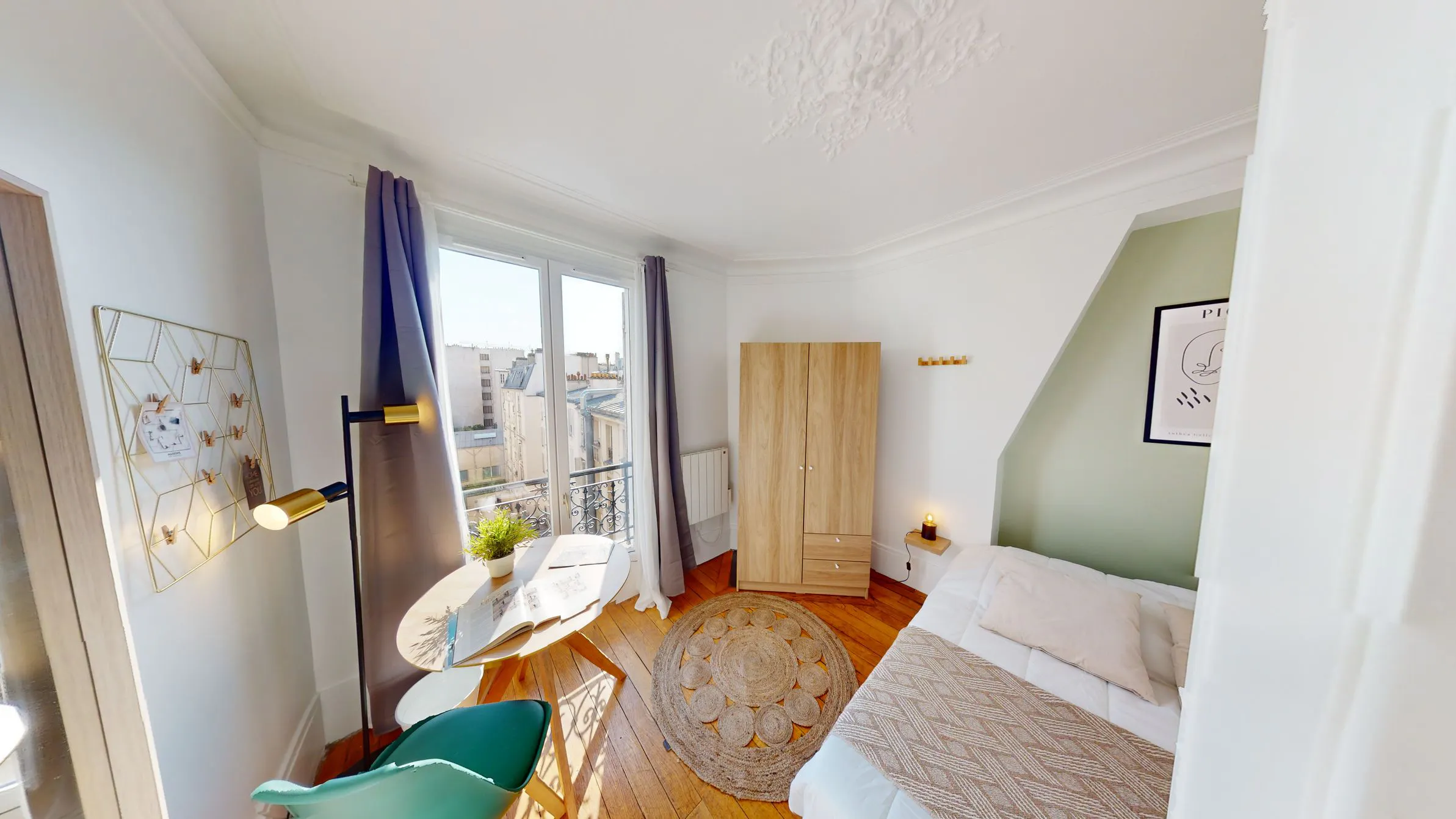 Works in the building until july 2025 facade renovation This flat does not have a dishwasher Furnished flat share ! All our flats are located in the city centre and close to all amenities and public transport (Metro, Tramway and Bus). This lovely private bedroom in a fully equipped, furnished and all-inclusive flatshare in Paris is a mix of comfort and design. It has got household furnishings, including a bed with pillows and duvet What is missing is your things to feel at home! The room can be locked if you need intimacy. All our rooms are fully furnished (bed, desk, wardrobe, duvet, pillows...). The flatshare can be found in the Grandes Carrières neighborhood, in the heart of Paris. Plenty of shops, public transports, restaurants are accessible close by. The apartment is on floor 6 without lift. It is entirely equipped and is composed of a large kitchen with refrigerator, microwave, pans, crockery, kitchen ustensils, kettle... The accommodation also contains an ironing board, a washing machine, a clothes rack, an iron. Additionally, you will find cleaning items in the accommodation: bagless hoover, dustpan and brush, broom, mop and bucket... Every Joivy furnished flatshare includes all expenses: housing insurance, water, electricity, unlimited wi-fi, condominium fees, household waste tax. All our flats are fully equipped (washing machine, dishes, decoration...) by our teams, who also take care of the technical and material maintenance. Minimum stay : 1 mois Apartment eligible for CAF up to 258€ / month. The CAF for Caisse d'allocations familiales is a free public service eligible for all, including foreigners and can help you financially to pay part of your housing according to your situation whether you are French or foreign. To find out the potential amount of your assistance, go to the CAF website and complete the online APL (housing assistance) estimate. Service fee : from 490€ The service fee covers the writing of the lease but also the assistance throughout your stay. The service fee covers the repair and maintenance of the equipment as well as access to our ultra-reactive support in case of need for intervention in your accommodation. Deposit : 1100...