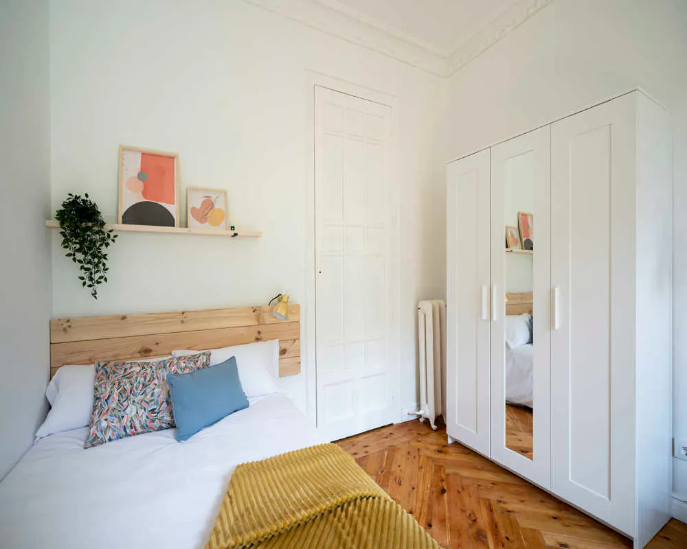 Bright living in *Chamberí/Trafalgar/Almagro/Vallehermoso* , steps from shops and transport. A welcoming room in a large shared flat with thoughtful communal spaces and plenty of natural light. Featuring a queen-size bed, 16.1 m2 of private space, and balcony access, this room offers comfort and convenience. The apartment includes 4 bathrooms, a washing machine, oven, microwave and reliable *Wi‐Fi* to keep your daily routine smooth. The building provides an *elevator* for easy access to the third-floor flat, which sits in an eight-floor residence designed for comfortable shared living. Ideal for students or young professionals seeking a spacious, well-equipped home base in Madrid with great local connections and amenities. Limited availability — book a viewing soon! Current tenants: 5: 45, Female, Worker 8: 24, Female, Student Please be aware that HousingAnywhere is an online booking platform. Therefore exchanging contact details and offering viewings is not possible. If you would like to reserve this accommodation, send me a booking request or a message and please mention your age and occupation. I look forward to talking to you! CONTRACT Please, note that to all our listings we apply fortnightly contracts. This means that If you check-in during the first half of the month, you will be charged for the full month. If you check-in during the second half of the month, you will only be charged for the second half. The second half of the month starts on the 16th. If you check-out during the first half of the month, you will only pay until the 15th of that month. If you check-out during the second half of the month, you will be charged the full month. Tenants can establish legal residency using the accommodation's address....