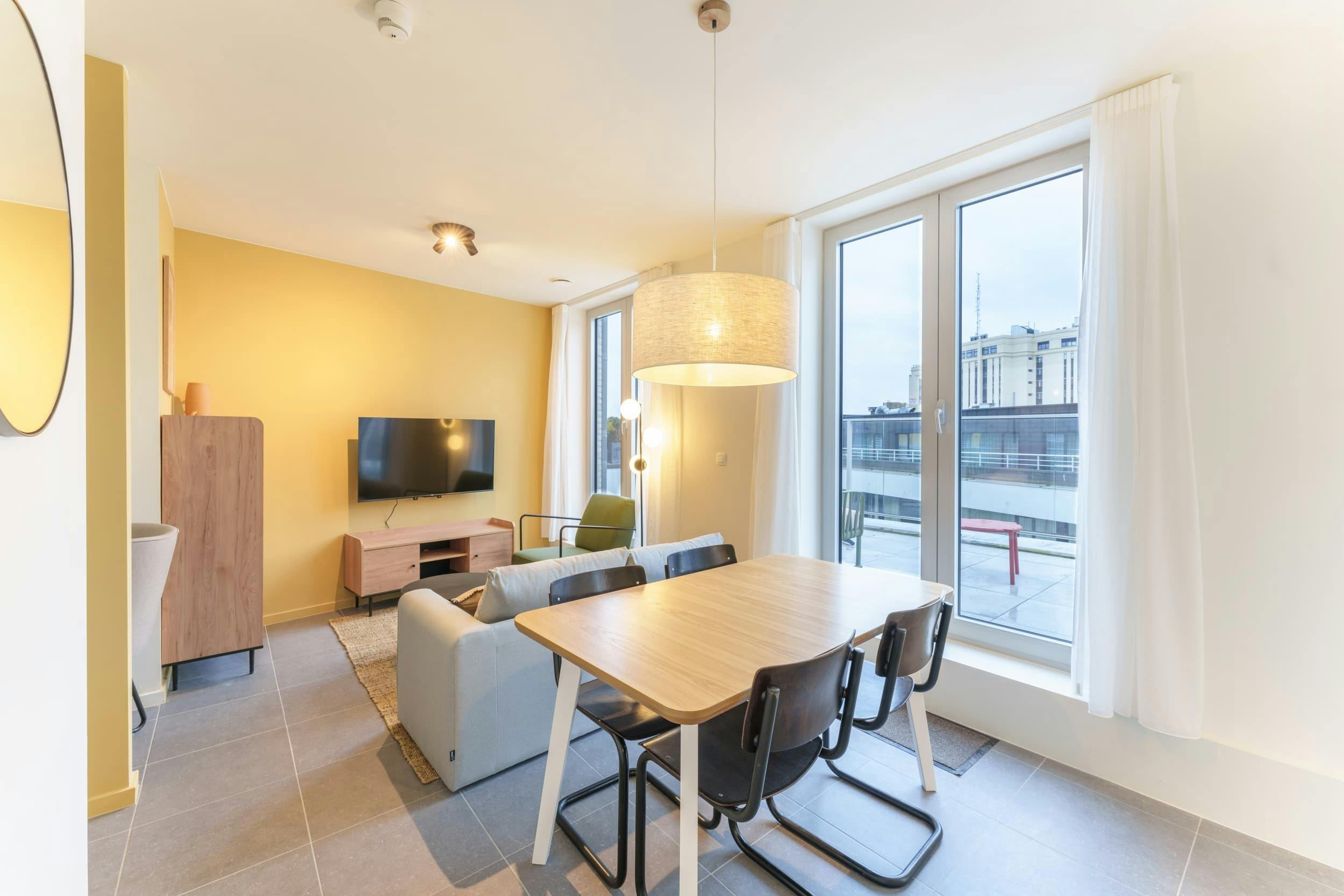 Discover this exceptional private two-room apartment ideally situated in the vibrant heart of Antwerp. Offering 58 sqm of thoughtfully designed space, this upscale residence invites you to experience comfortable city living from day one. Fully furnished and ready to move in, it provides all the essentials for a convenient and enjoyable stay. The apartment features a bright, spacious living area with a large sofa, TV, and a stylish dining table accommodating four guests—perfect for relaxing or entertaining. Step out onto your cozy terrace, an ideal spot for morning coffee or evening unwind. The fully equipped kitchen includes ceramic plates, an oven, hood, dishwasher, washing machine, kettle, and complete dishware, facilitating seamless home-cooking experiences. The bedroom is a sanctuary of comfort, featuring a 160x200 bed, bedside tables, and ample storage space. Adjacent is a private bathroom with a shower and toilet, offering privacy and convenience. Additional amenities include high-speed internet, modern decor, and built-in storage solutions throughout the apartment. The residence itself offers bicycle parking, a social lounge, a gym, and friendly administrative support—creating a perfect blend of comfort and practicality. Located just a few minutes' walk from supermarkets, restaurants, bars, a gym, and a cinema, the apartment is perfectly positioned for urban living. Excellent public transport options, including Antwerpen Opera stations on multiple tram and metro lines, are within a 3-minute walk, ensuring easy access to the entire city. Experience the best of Antwerp with this stylish, fully equipped residence—your ideal home in the city’s lively center...
