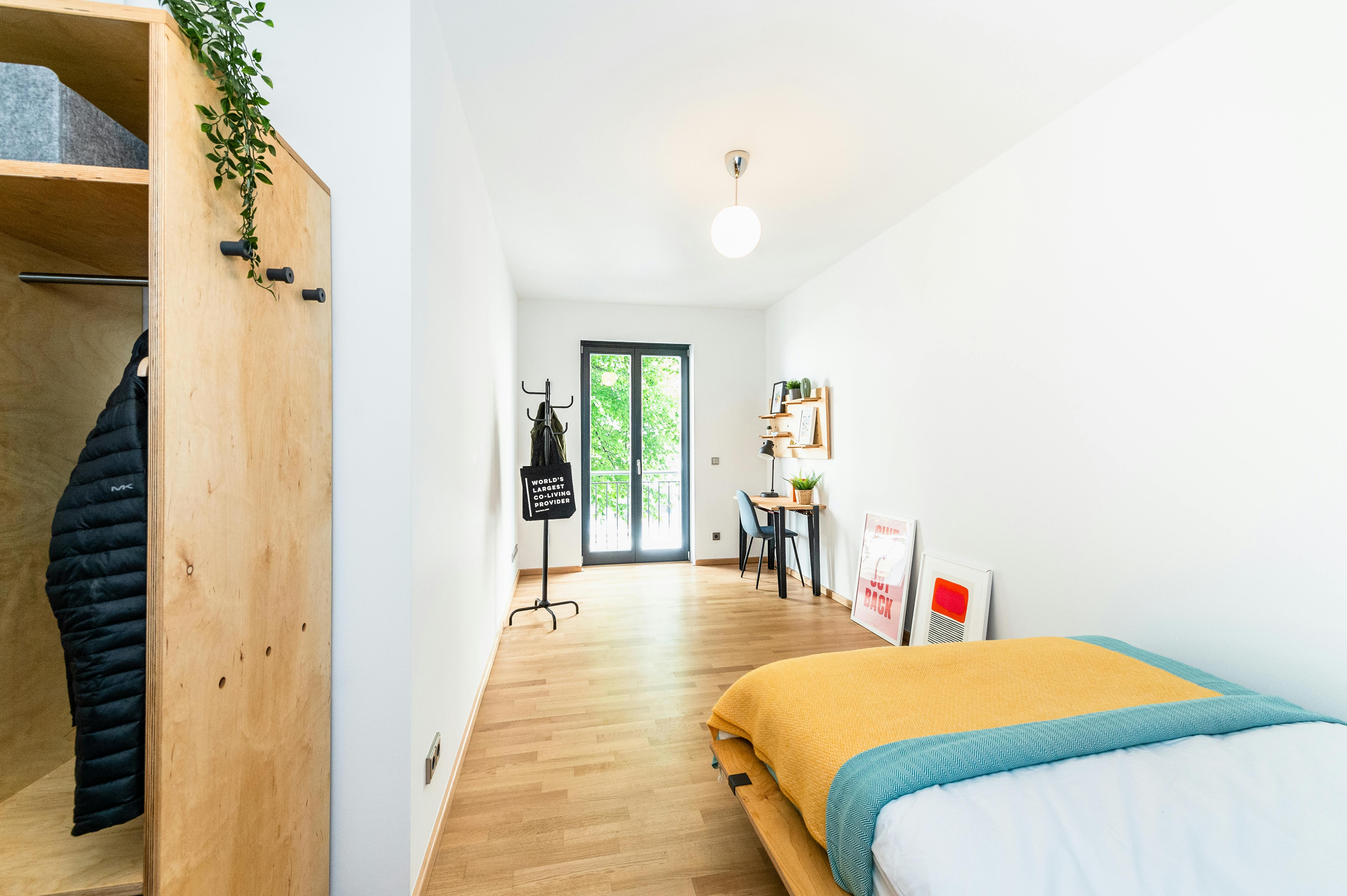ROOM Our rooms come fully furnished with everything you need such as a custom-made wardrobe and bed frame including a comfy premium mattress. Depending on size you’ll also have a nightstand and desk in there. If you want to work on that tan, you can get one of the rooms with a private or shared balcony or terrace. APARTMENT The kitchen is fully stocked for any wannabe-chef to get creative in – you’ll have all the pots, pans and knives, as well as a fridge to keep things cool. The dining area is a great space to hang and invite your roomies over for dinner. All apartments entail one or two spacious bathrooms that you’ll be sharing with your room mates. To keep things clean and tidy, you can use the washing machine that’s placed in every apartment. PROPERTY Located at the heart of Friedrichshain, this is your ideal home to explore all the hidden gems the city has to offer. The building has a big community room with a football table, co-working area and lots of space to hang out in. The backyard entails bike stands and lots of green to enjoy....
