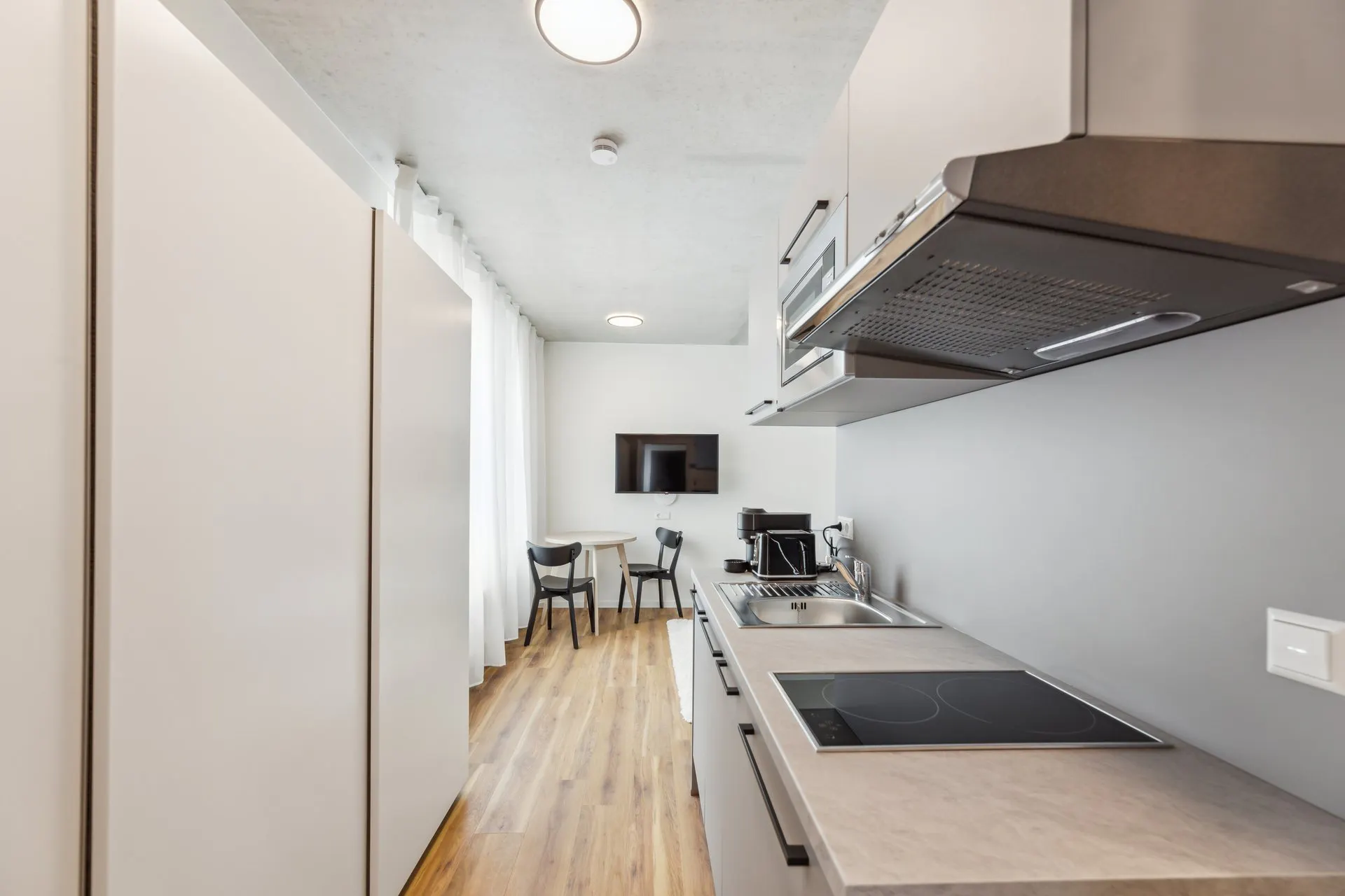 APARTMENT All our studios are fully equipped with everything you need to feel right at home. Enjoy the many amenities at your disposal, including a fully equipped kitchen, a comfortable bed with a premium mattress and bedside tables, an ensuite bathroom, and a versatile area with a table and two chairs, perfect to work or dine. While regular cleaning is not included, it can be booked upon request.Please note, if you are booking as a couple, there will be an additional 200€ charge added to the price of the studio. PROPERTY Combining the vibrancy of Berlin with natures serenity, the Waterfront was crafted with wood and raw textures, blending modern art and colorful accents. The property is purposefully built to be an ideal location for you to make the most of the co-living lifestyle, and be part of the (hidden) community. On the ground floor, tenants are invited to enjoy and exclusive and stylish community area featuring a smart television, comfortable sofas, meeting rooms, working areas, and a shared kitchen. The Waterfront also includes a welcoming Café for tenants and their guests, offering multiple menu options to start the day and tasteful snacks to enjoy whenever you want....