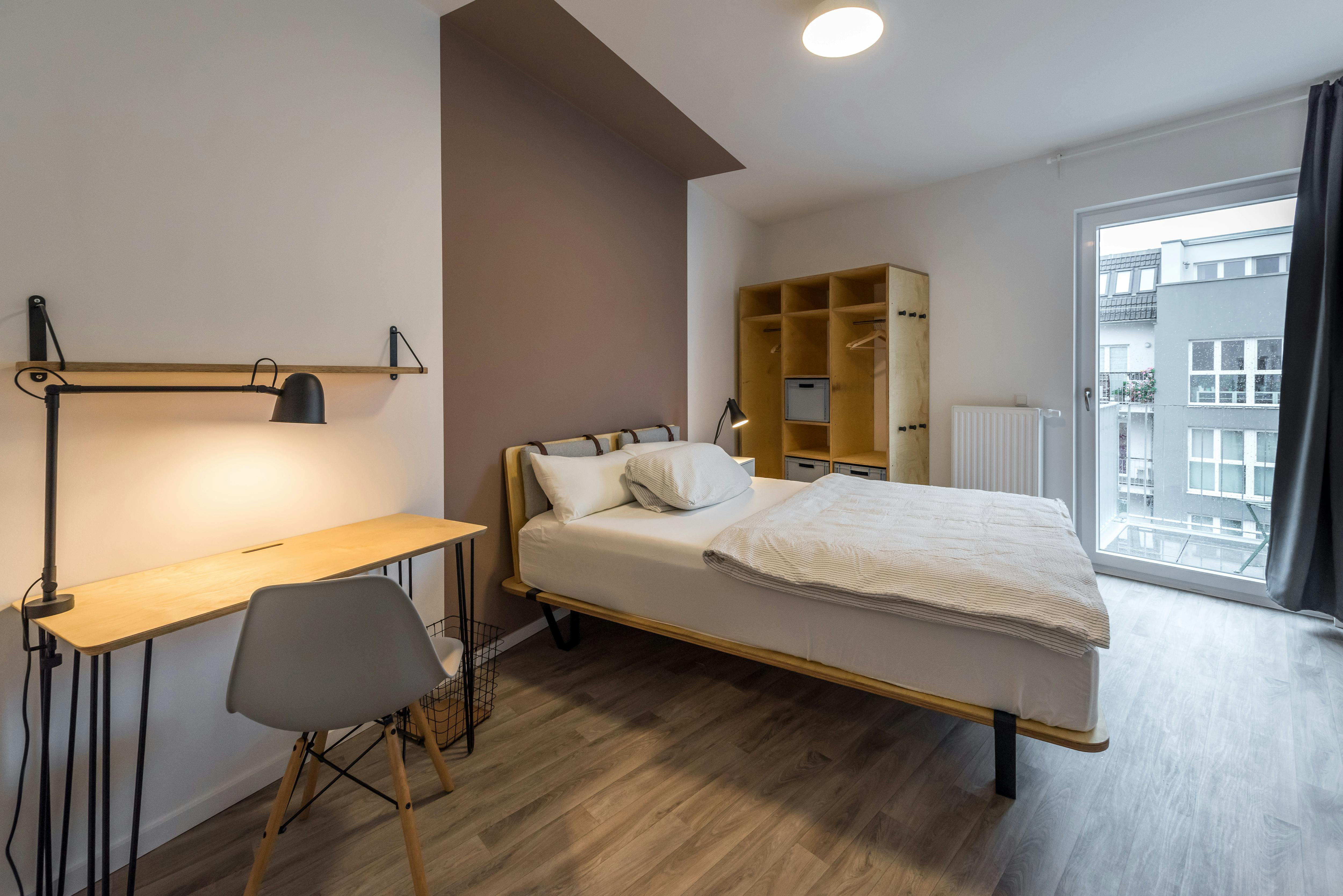 ROOM Our rooms come fully furnished with everything you need such as a custom-made wardrobe and bed frame including a comfy premium mattress. Depending on size you’ll also have a nightstand and desk in there. If you want to work on that tan, you can get one of the rooms with a private or shared balcony or rooftop terrace overlooking the city. APARTMENT The kitchen is fully stocked for any wannabe-chef to get creative in – you’ll have all the pots, pans and knives, as well as a fridge to keep things cool. The dining area is a great space to hang and invite your roomies over for dinner. All apartments entail one or two spacious bathrooms that you’ll be sharing with your flat mates. PROPERTY The backyard with its old trees also entails bike stands, lots of greenery to enjoy and one of Berlin’s coolest murals. The building has a big community room with a stunning garden view as well as a dedicated co-working area and lots of space to hang out in....