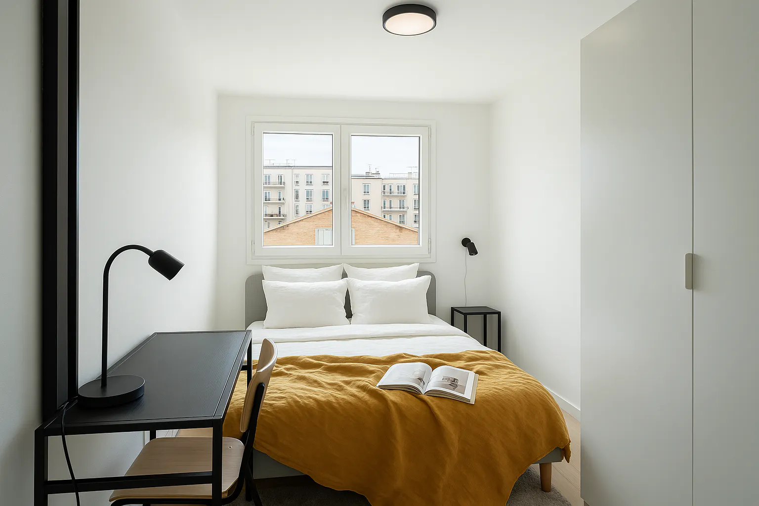 ROOM Our rooms are fully furnished with everything you need. In the bedroom area, you will find a bed with a comfortable mattress, as well as a bedside table, small lamp, and wardrobe. The bedroom is also equipped with a desk and chair, so you can easily work or study from home. Please note: Bedsheets are not provided, allowing you to personalize your space the way you like it! APARTMENT Our modern apartments each feature a spacious bathroom and a fully equipped kitchenette with the necessary appliances. PROPERTY Our location in Paris is the ideal place to experience the vibrancy of the city while being part of the (hidden) community. With a total of 24 flats and 32 rooms, the building features a laundry area on the first floor, and a community space where you can relax, meet new people, and enjoy all the perks of a flexible lifestyle....