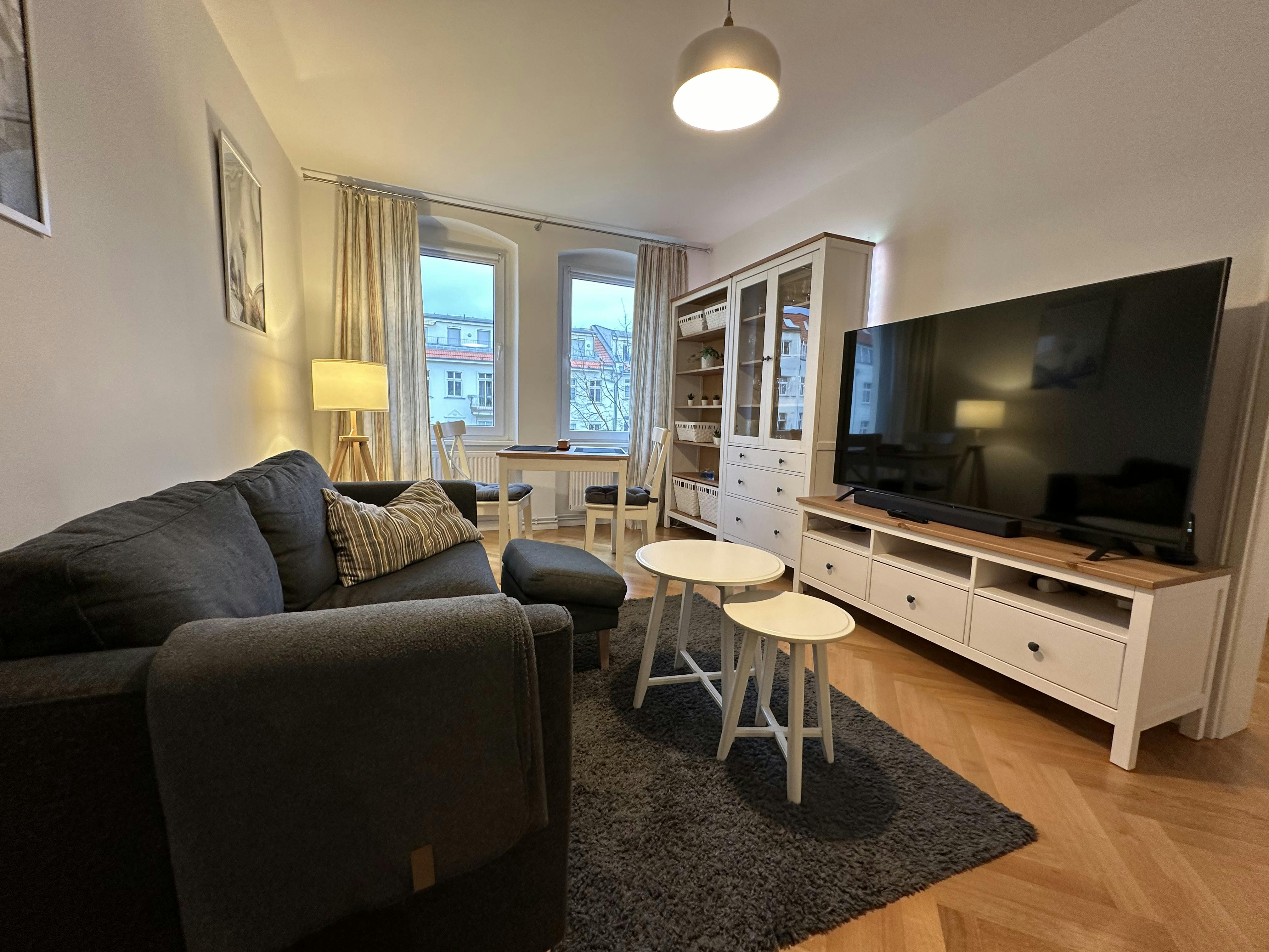 Overview - Central location in Mitte, close to Arkonaplatz, Kastanienallee, Torstr. - Building modernized in 2017 - Refurnished in 2022 - Supermarkets and Shops in walkable distance - Subway (U8) and Tram (M10, M8, 12) stops very close - Real wood parquet flooring - Premium bath and kitchen - Bedroom with 6-door wardrobe - 1GBit/s internet connection - Desk with 27" 4K display in the bedroom - Home cinema with LG 65" 4K HDR TV and LG 2.1 Soundbar - Smarthome: Heating, living room lighting Very cosy apartment in one of the best (hidden) of Mitte between Arkonaplatz/Kastanienallee, Torstraße/Scheunenviertel and the Berlin Wall Memorial. Enjoy a freshly (2022) furnished apartment with parquet floor in all rooms, lots of storage and a clever room design. Relax in a cosy living room with a LG 4K 65" HDR Smart-TV that gives you a home cinema feeling. Smart light bulbs let you dial in the right ambiance for the whole room. The apartment features a premium kitchen equipped with everything you need from fridge to dishwasher. There is even a Sodastream, an air fryer, a Tassimo coffee machine and a washing machine with integrated dryer. In the bedroom, there is a comfy 140cm wide bed with a spring mattress (20cm thick). The 6 door bedroom wardrobe offers a lot of space for all your clothing - and more. Also, a small desk to work from home is located in the bedroom - outfitted with a 27" Dell 4K display. The apartment has Gigabit internet and a Wifi 6 router for maximum speed. The whole building is equipped with a master key system: One key opens everything. There is also a video intercom installed. Public transportation: Subway station of line U8 right in front of the building, trams M10, M8 and 12 very close by. Long distance train stations Berlin Central and Berlin Gesundbrunnen are just a few minutes by taxi/tram/subway away. There are bike racks and lockable bike storage room. Supermarkets, shops, restaurants, bars, parks and nearly everything else you'd ever need are in walking distance...