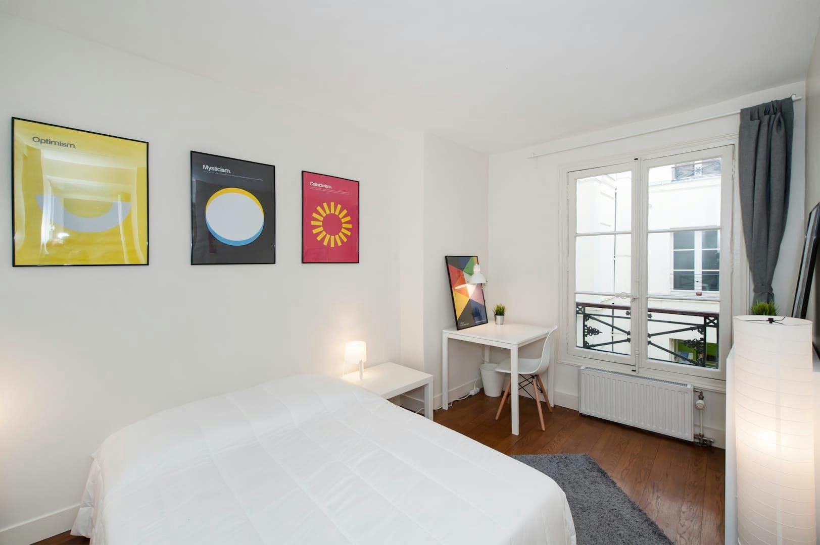 Furnished flat share ! All our flats are located in the city centre and close to all amenities and public transport (Metro, Tramway and Bus). This lovely private bedroom in a fully equipped, furnished and all-inclusive flatshare in Paris is a mix of comfort and design. It has got household furnishings, including a bed with pillows and duvet What is missing is your things to feel at home! The room can be locked if you need intimacy. All our rooms are fully furnished (bed, desk, wardrobe, duvet, pillows...). The flatshare is located in the "Marais" neighborhood, in the centre of Paris. Plenty of restaurants, shops, public transports are available close at hand. The apartment is on floor #4 . It is entirely furnished and includes a fitted kitchen with fridge, crockery, kettle, toaster, kitchen ustensils, microwave, pans... The flat also has an iron, a clothes rack, a washing machine, an ironing board. You will also find cleaning items in the flatshare: bagless hoover, broom, mop and bucket, dustpan and brush... Every furnished flatshare includes all expenses: housing insurance, unlimited wi-fi, household waste tax, water, electricity, condominium fees. All our flats are fully equipped (washing machine, dishes, decoration...) by our teams, who also take care of the technical and material maintenance. Minimum stay : 1 mois Apartment eligible for CAF up to 258€ / month. The CAF for Caisse d'allocations familiales is a free public service eligible for all, including foreigners and can help you financially to pay part of your housing according to your situation whether you are French or foreign. To find out the potential amount of your assistance, go to the CAF website and complete the online APL (housing assistance) estimate. Service fee : from 990€ The service fee covers the writing of the lease but also the assistance throughout your stay. The service fee covers the repair and maintenance of the equipment as well as access to our ultra-reactive support in case of need for intervention in your accommodation. Deposit : 1100...