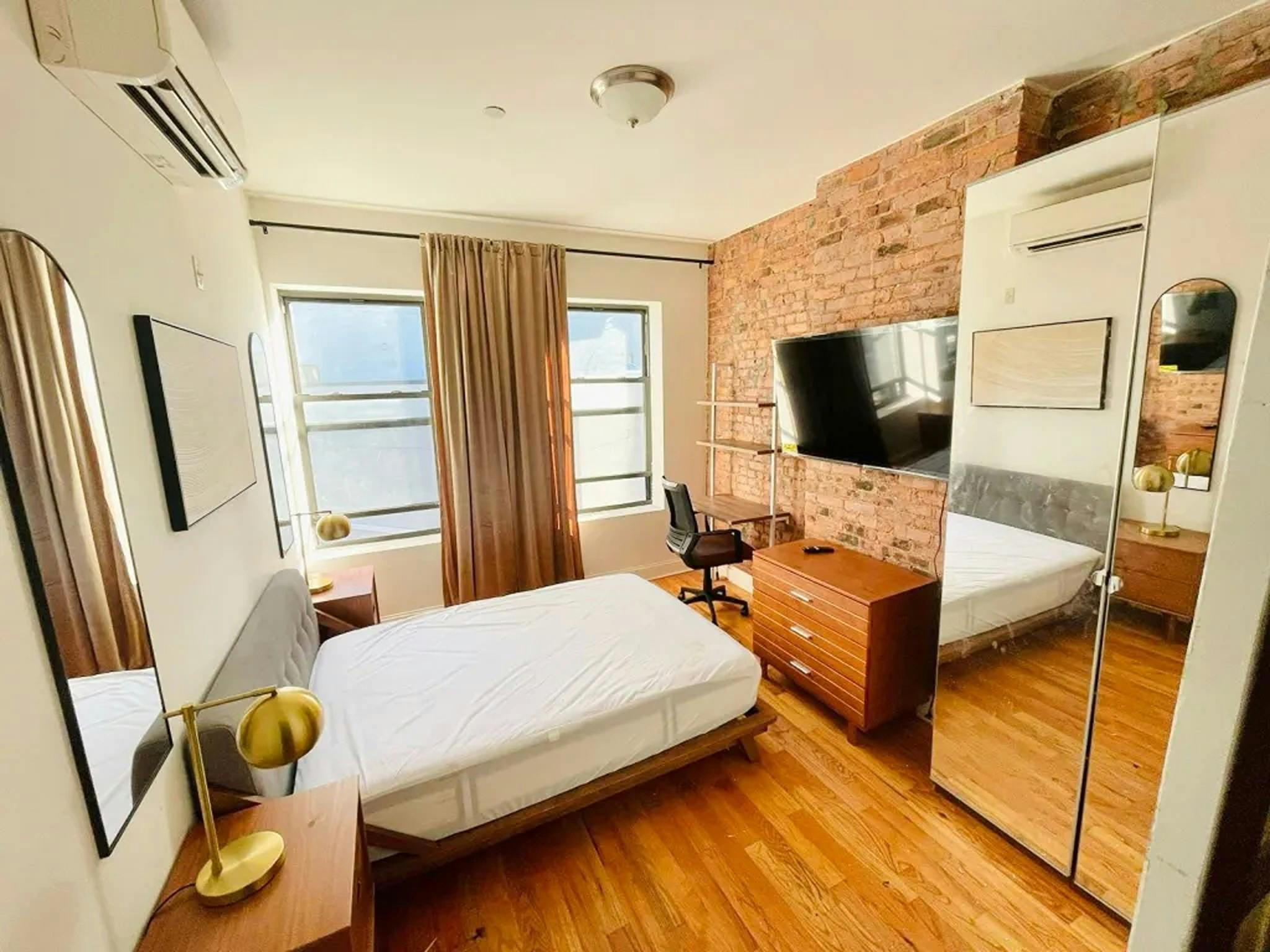 Myrtle Ave #106 - Furnished room, new hardwood floor, in a 4 bedroom, 2 bathroom, recently gut renovated apartment. - Trains: L and M. Myrtle-Wyckoff Avenue Subway Station. - Furniture to be included: bed, mattress, closet, bed stand, curtains/shades, desk, chair, sofa, kitchen table. - Washer and dryer inside the apartment. - On the same block as cafe’s, restaurants, gym (Blink Fitness), bars. - Utilities: $165 per month (Internet, gas, heat, hot water). - Location: Myrtle Ave and Cornelia St. - There is a one-time room cleaning and administration cost of $12...