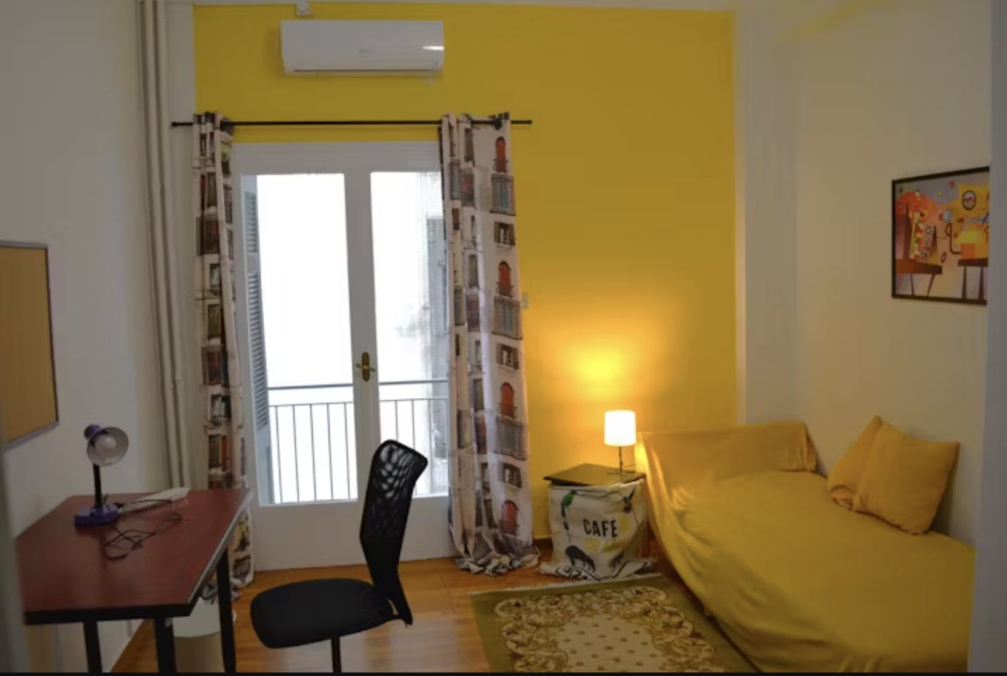 A totally renovated, spacious, sunny and peaceful 60 sq. m. apartment in the center of Athens in close proximity to most Universities - a 12 min walk in slow tempo to the Athens University of Economics and Business (AUEB), 13 min to Victoria metro station - and the city center. If you choose the public transport - right next to your door 4 minutes walk to the bus and trolleybus stop. The apartment is placed at the lower end of the popular artistic neighbourhood of Kipseli, close to Amerikis square at the end of the famous pedestrian area of Fokionos Negri (at a 4min distance by foot), a well-known area for its life style with theatres, bistros, bars, restaurants and live scenes, its artists, musicians, actors, students). Entertainment: 4 min walk to to the Fokionos Negri pedestrian area and 10 min to the famous st. George's Square. Both places are full of coffeeshops, bars, live stages, souvlaki and restaurants. 4 min walk to the shopping street of Patision. The apartment has two independed fully furnished bedrooms each one with wooden floor, desk with lamp, office chair, bed (single), nightstand with lamp, spacious closet and bookcase. Both rooms are equipped with an air conditioning unit and a steady voltage unit. The apartment is equipped with a safety entrance door using a special key. There is also a common area hall/ living room. Next to it is placed a fully equipped kitchen (electric stove, microwave , fridge, coffeepot for filter coffee and a lot of cupboards) and to the left a corridor leading to the bathroom (which contains bath tub, toilet, washbasin and a washing machine). Fast and consistent Wireless 300mbps Wi-Fi (with unlimited data plan) as well as all utility bills (electricity, water, air conditioning) are included in the price of the rooms. DETAILS The second bedroom in the flat, complete with a single size bed, nightstand with lamp, desk + office chair, bookcase, large closet, air conditioning unit and large double doors leading out to the small balcony which overlooks the inner backyard with trees and other buildings...