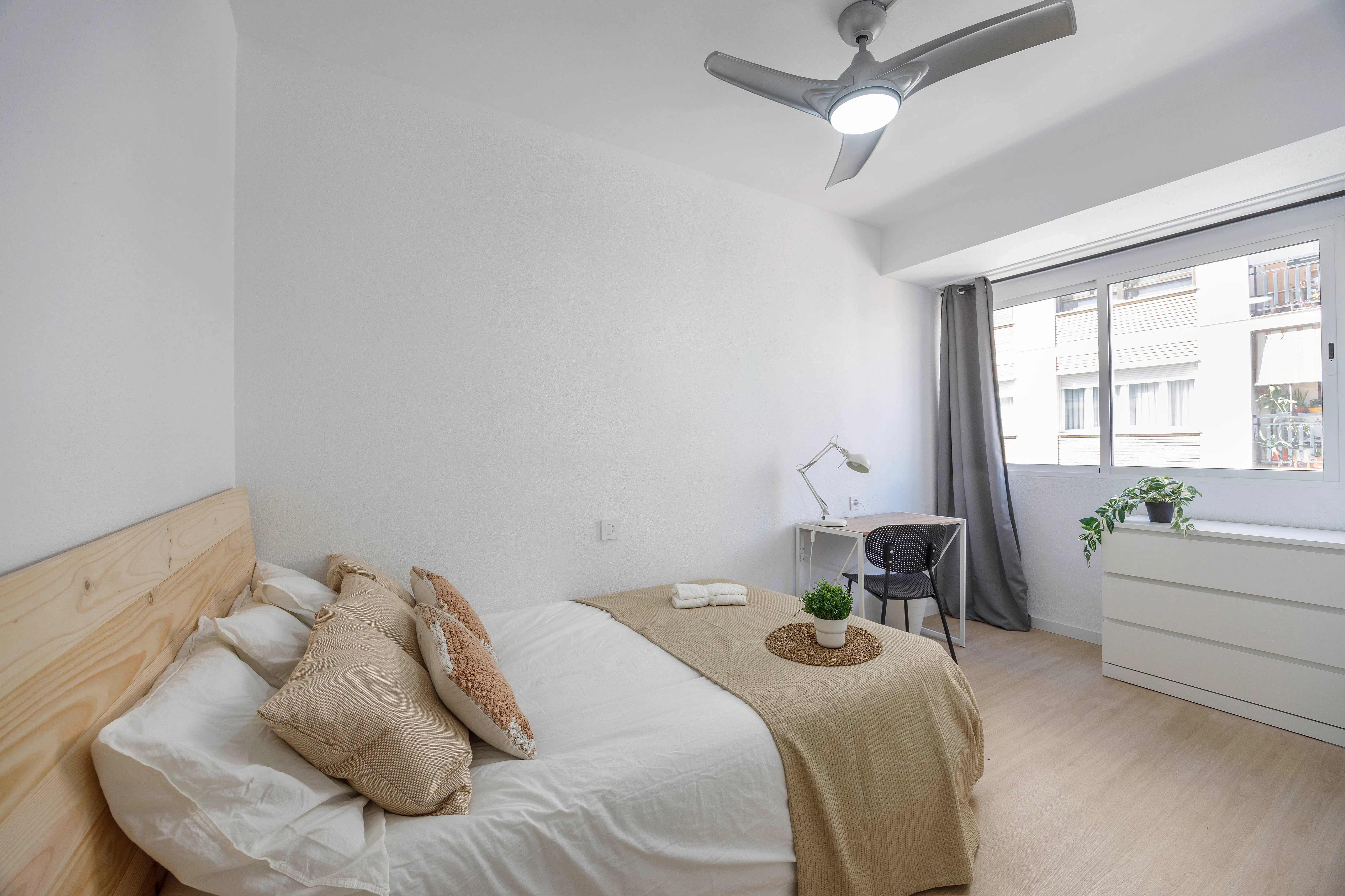 ROOM: Bright double room in Benimaclet. It is a very good option if you are a student or young worker and you want to spend some time in the beautiful city of Valencia. It is a fully equipped and furnished room: - Bed 120x190cm - Wardrobe - Desk with lamp and chair - Bedside table -Chest of drawers - Window with outside view - Lock for your privacy - Ceiling fan APARTMENT: The flat is 120m2 and has 6 bedrooms, 2 complete bathrooms. The common areas are really nice, with air conditioning and fully equipped kitchen with: - Ceramic hob - Refrigerator - Oven - Microwave oven - Crockery and cutlery NEIGHBOURHOOD: Benimaclet is the student neighbourhood par excellence. Its excellent communication with the universities, as well as its proximity to the beach, makes it year after year the preferred destination for students and young professionals, both national and foreign. The neighbourhood is full of shops, such as supermarkets, cafes, pubs, restaurants, stationery shops, gyms, so the offer is very wide Metro stops: - Benimaclet: Lines 3, 4, 6 and 9. Bus stops: - Emilio Baró 177: Lines 70 and 12 - Primado Reig 194: Lines 89 and 98 Points of interest: - Arena shopping centre: - Horchatería Rin: one of the reference horchaterias in the city of Valencia, where you can taste the authentic horchata. - Nightlife EXPENSES: The rental price includes internet and a weekly cleaning of the common areas. The costs of utilities are as follows: -Water: 10€/month -Electricity: 40€/month, if any month the consumption is more than this, the difference will be paid separately. In this case, the expenses are shared equal parts between the tenants. CLEANING SERVICE: We offer a free cleaning service once a week of the communal areas. It is the tenant's responsibility to keep the flat clean, tidy and in good condition. Our cleaning service is mainly to help you with the cleaning, but it is important to keep everything clean. Cleaning products must be provided by the tenants. You can find a list of the necessary cleaning products in the flat. BEDROOM CLOTHING: For a hygienic reason, we do not provide any bed linen, neither pillow, duvet or duvet cover. CHECK IN AND CHECK OUT: Check in will take place at the office. Once your booking is confirmed, you will receive details of how to get to the office, but it is within easy reach of the airport. We will meet you here to complete the payments, sign the rental contract and provide you with a set of keys to your new home. Check-in hours will be from 16:00 to 20:00. If you arrive in Valencia earlier you can leave your luggage in my office in the meantime. If you arrive later than 8:00PM we will leave the keys at a 24H point. Check out will be at the latest on the last day of the rental contract at 11:00AM. If your flight is after this time, you can leave your luggage here at the office free of charge...