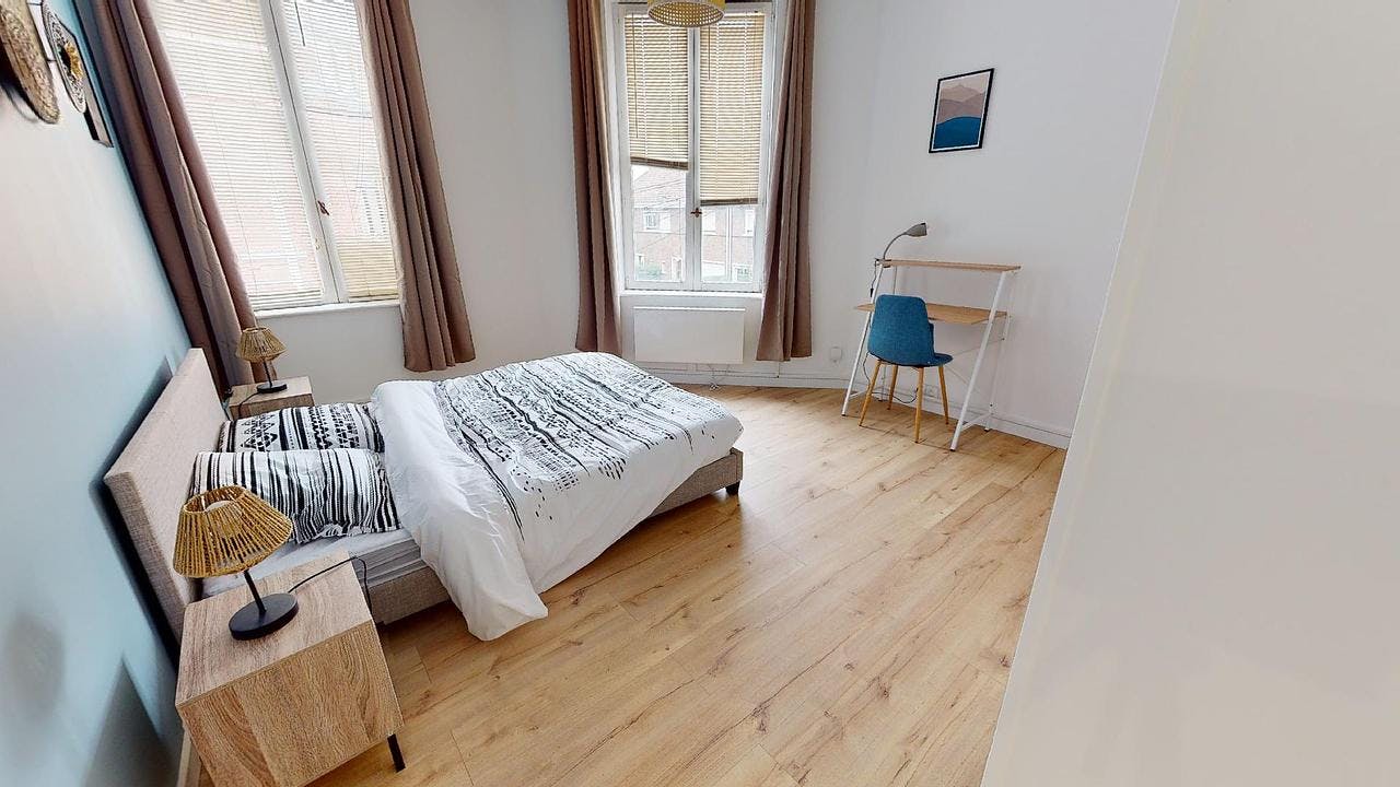 Notre agence vous présente cette colocation de 4 chambres de 127m2 située dans une maison individuelle sur la commune de Roubaix au 14 Rue Berthollet. 🏠 ESPACES COMMUNS La maison comporte plusieurs étages. Le rez-de-chaussée est composé des parties communes. La cuisine est toute équipée avec de nombreux rangements, des plaques à induction avec une hotte, un évier et un égouttoir, un four et un micro-ondes, un réfrigérateur, une machine à café et une bouilloire. Le spacieux salon se compose d'un canapé deux places, de deux tables basses, un fauteuil avec son repose pied, un meuble tv avec la télévision, une table à manger avec quatre chaises et de nombreux cadres en décoration. Les chambres quant à elles se trouvent dans les étages. Deux des chambres se trouvent au 1er étage qui comporte deux salles de bains chacune comprenant une cabine de douche, des toilettes, un meuble vasque avec un rangement miroir. Il s'agit de la même organisation avec le deuxième étage. Une petite cour est accessible depuis la cuisine au rez-de-chaussé. 🛏️LA CHAMBRE La spacieuse chambre se compose d'un lit double, deux tables de chevet avec leurs lampes, un bureau avec chaise et lampe ainsi qu'un placard mural. 🏙️ QUARTIER Cette colocation est idéalement située : à moins de 15 minutes à pied du centre ville de Roubaix à proximité de tous les commerces nécessaire à la vie de tous les jours à moins de 8 minutes de l’arrêt de TRAM Jean Moulin à 11 minutes à pied de l'arrêt de métro Roubaix Charles de Gaulle desservi par la ligne M2 à proximité de l’IFSI/IFAS Les lignes de bus C12 et L8 circulent également dans un rayon de 300 mètres autour du logement. ———————————————————————— Bail individuel à la chambre. Pas de caution solidaire. Chacun est libre de partir quand il veut sans se soucier des autres colocs, dès le moment où il respecte un mois de préavis. Eligible aux APL. Les informations sur les risques auxquels ce bien est exposé sont disponibles sur le site Géorisques : (hidden) Montant estimé des dépenses annuelles d'énergie pour un usage standard : 2873 € par an. Prix moyens des énergies indexés sur l'année 1er janvier 2021 (abonnements compris...