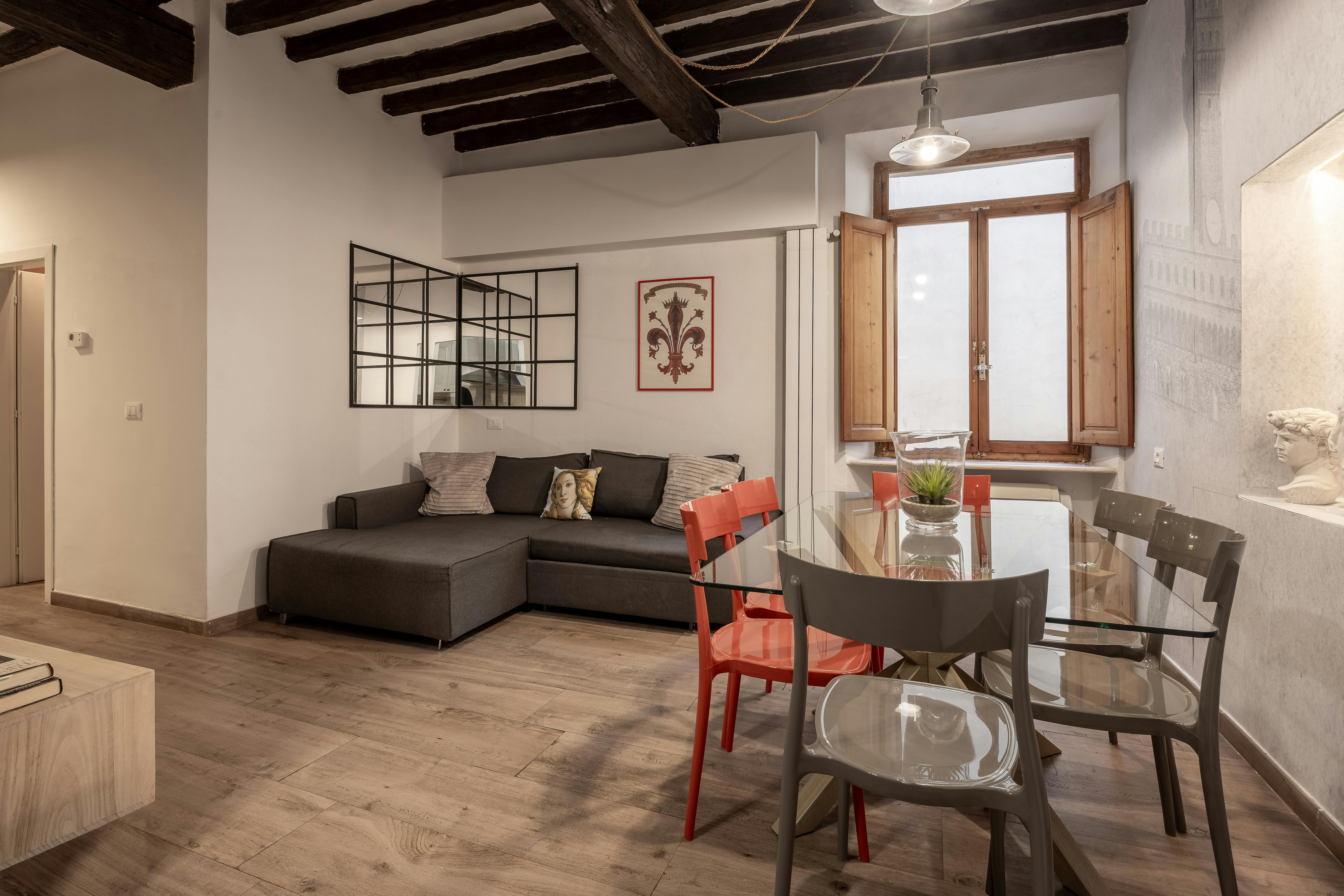 Welcome to this enchanting apartment located in via Laura, in the beating heart of the historic center of Florence, between the magnificent Duomo and the renowned Piazza Santa Croce. This modern jewel will welcome you with its warmth and impeccable style.Please note that access to the apartment is via a steep internal staircase, original and typical of Florence, made of pietra serena, a historical element characteristic of buildings in the historic center. Accepted payment methods: Cash Bank transfer Credit card PayPal Other costs: Contract registration fee: €100 Final cleaning (mandatory): The amount is available in the "Services and expenses" section and will be paid at check-out. Condominium fees: Yes, they are included in the rental price. TARI (Waste Tax): Yes, it is included in the rental price. Weekly/biweekly/monthly cleaning service (optional): €50 per cleaning service. Check-in/out: Check-in times: From 2:00 PM to 8:00 PM. Check-out times: By 10:00 AM. Required documentation: ID card/passport Tax code Your landlord speaks: English Italian The apartment, tastefully furnished, offers a bright and comfortable space for your stay. The open-plan living room and kitchen create a convivial atmosphere, ideal for relaxing and socializing. The two bedrooms, one double and one single, guarantee privacy and comfort, while the two bathrooms add practicality to meet the needs of all guests...