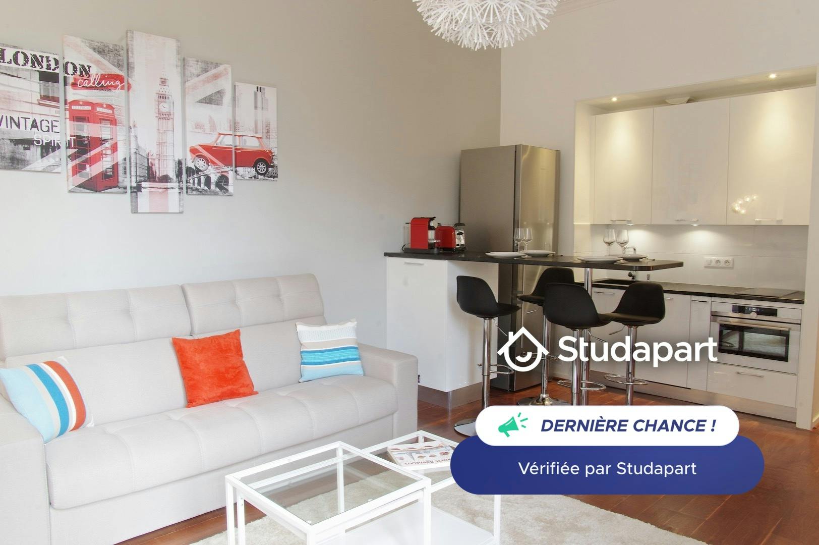 Au pied des Grands Hommes à Bordeaux, découvrez cet appartement une chambre de 40m2, en location meublée, tout équipé ! Il se trouve au 2e étage avec ascenseur d'un très bel immeuble en pierre, au début de la petite rue Montesquieu, proche de tous les commerces et en plein centre ville. 🅿️ Possibilité place de parking avec supplément. Il comprend : - 🚪un hall d'entrée, - 🛋 une pièce principale avec un canapé (convertible en 160 x 200 cm), une table basse, un bar avec quatre chaises, une commode, une TV et internet/wifi, - 🍳 une cuisine américaine entièrement équipée avec réfrigérateur/congélateur, plaque à induction, lave-vaisselle, four combiné, cafetière, grille-pain, bouilloire et tout le nécessaire pour cuisiner, - 🛏 une chambre indépendante avec un lit double de 160 x 200 cm et une penderie, - 🚿 une salle de douche séparée avec lavabo, sèche-cheveux et sèche-serviettes, - 🚽 un WC indépendant. ➡️ L’appartement est également équipé de lave-linge, fer et table à repasser. ➡️ Le linge de maison est fourni (draps, serviettes et torchons) et les lits sont faits à votre arrivée. 📍A proximité de l’appartement : - centre commercial des Grands Hommes au pied de l'immeuble - cours de l'Intendance à 100m - arrêt de tram "Grand Théâtre" (ligne B) à 300m - arrêt de tram "Quinconces" (ligne B, C et D) à 5 min à pied (500m) Le loyer s’entend toutes charges comprises (eau, électricité, chauffage, internet, partie communes, etc.). Tout dossier sera étudié (revenus et/ou garants). Updated on 19/02/2026 Le propriétaire de ce bien utilise Studapart pour louer son logement en toute sécurité. *Comment ça marche ?* Vous recevez un email Studapart et cliquez sur le lien de l’annonce. Vous créez votre compte Studapart et envoyez votre candidature (dossier + message) sans aucun frais. Si votre profil est retenu, vous pourrez faire une demande de réservation. Les frais Studapart ne sont débités qu’en cas de confirmation de réservation afin de vous garantir une location 100% sécurisée...