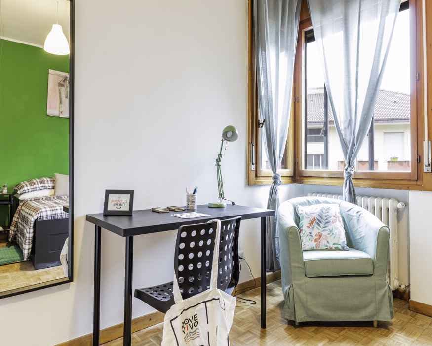 Single room in a shared apartment, composed by 3 bedrooms and 2 bathrooms. Of about 16 sqm with a one and a half bed and a work station. With wifi, terrace, bike parking, garden, dishwasher, washing machine. Energy class: D, IPE 61.56 Kwh/Sqm year. Current tenants: 1: 24, Female, Student 3: 19, Female, Student Please be aware that HousingAnywhere is an online booking platform. Therefore exchanging contact details and offering viewings is not possible. If you would like to reserve this accommodation, send me a booking request or a message and please mention your age and occupation. I look forward to talking to you! CONTRACT Please, note that to all our listings we apply fortnightly contracts. This means that If you check-in during the first half of the month, you will be charged for the full month. If you check-in during the second half of the month, you will only be charged for the second half. The second half of the month starts on the 16th. If you check-out during the first half of the month, you will only pay until the 15th of that month. If you check-out during the second half of the month, you will be charged the full month....