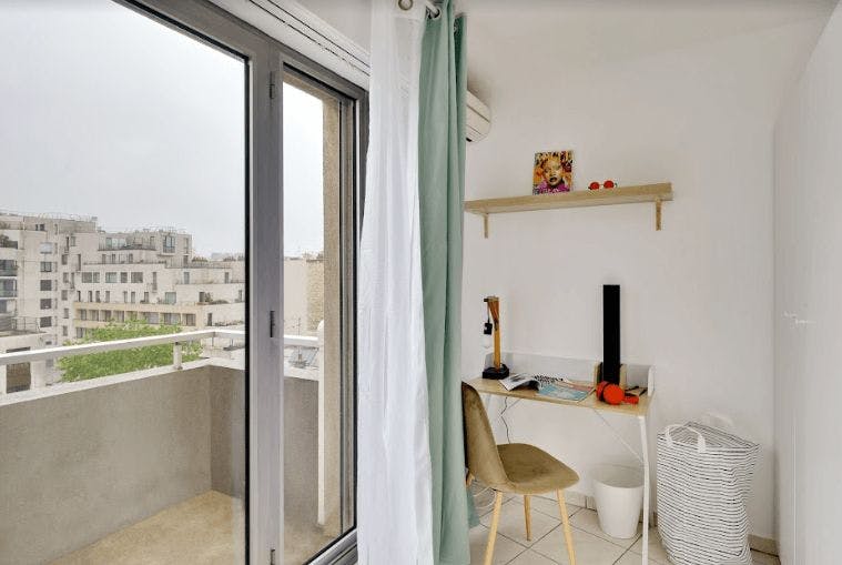 This flat can welcome adult tenants Get in touch with our team for more details Furnished flat share ! All our flats are located in the city centre and close to all amenities and public transport (Metro, Tramway and Bus). This lovely private bedroom in a fully equipped, furnished and all-inclusive flatshare in Paris is a mix of comfort and design. It has got household furnishings, including a bed with pillows and duvet What is missing is your things to feel at home! The room can be locked if you need intimacy. All our rooms are fully furnished (bed, desk, wardrobe, duvet, pillows...). The flatshare is ideally located in the "Buttes Chaumont" neighborhood, in the centre of Paris. Plenty of restaurants, public transports, shops are accessible close by. The apartment is on floor #7 . It is ready-to-live-in and is composed of a fitted kitchen with refrigerator, microwave, kettle, kitchen ustensils, pans, toaster, crockery... It also has an ironing board, a clothes rack, an iron, a washing machine. Additionally, you will find cleaning items in the accommodation: mop and bucket, broom, bagless hoover, dustpan and brush... Every furnished flatshare includes all expenses: water, housing insurance, household waste tax, electricity, condominium fees, unlimited wi-fi. All our flats are fully equipped (washing machine, dishes, decoration...) by our teams, who also take care of the technical and material maintenance. Minimum stay : 1 mois Apartment eligible for CAF up to 258€ / month. The CAF for Caisse d'allocations familiales is a free public service eligible for all, including foreigners and can help you financially to pay part of your housing according to your situation whether you are French or foreign. To find out the potential amount of your assistance, go to the CAF website and complete the online APL (housing assistance) estimate. Service fee : from 490€ The service fee covers the writing of the lease but also the assistance throughout your stay. The service fee covers the repair and maintenance of the equipment as well as access to our ultra-reactive support in case of need for intervention in your accommodation. Deposit : 1100...