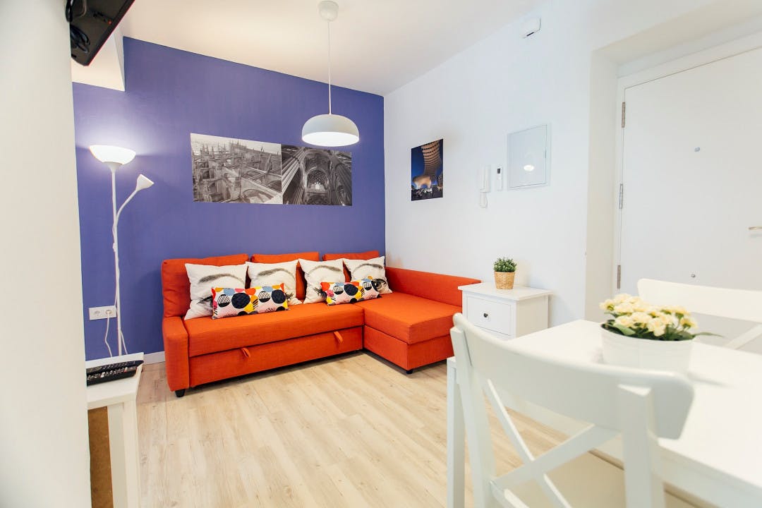 This modern apartment ideal for corporate travelers, expats, and monthly rentals, has a 55sqm surface. The space is divided in: - 3 bedrooms - 1 bathroom The building has intercom . The flat is ideal for 5 people, nevertheless, this MintyStay apartment can host up to 7 guests, including its sofa-bed. Main bedroom has a double bed & an independent bathroom with shower plate, whereas the rest of the bedrooms have: - double bed. - an individual bed Regarding toiletries, and as per hotel industry standards, you will find soap, gel & shampoo for you first overnight stay. The house has an independent kitchen, which is fully equipped with every needed home appliances (fridge, oven, microwaves, dishwasher, vitroceramic), cookware and kitchen utensils for cooking and, most important, enjoying doing it. The flat also has: working desk, american coffee maker, , kettle, hair dryer and iron. Furthermore, you will also find a washing machine and a dryer. You also will have a space which can be used as dining rooms or living room, with all necessary material to feel just like at home. The living room has a L-shaped sofa with five seats and flatscreen TV. There is a central heating system installed to make sure you never get cold in winter days. As for the summer, you will have a split AC equipment . WiFi connection is also installed. We make sure everything is well prepared for a perfect stay. Supply expenses, WiFi, water, electricity & heating, are covered by your accommodation as long as it does not exceed 150€/month. (hidden) will take care of the management and assist you during your stay in this serviced apartment. We offer many services upon request, such as regular cleaning (including) replacement of bed linen and towels, laundry, search for a parking space nearby and transfer service from/to the airport. Last but not least, at (hidden) we take the safety and ease of our guests and collaborators very seriously. This house has a guarantee of disinfection according to the official protocol for cleaning and sterilization of accommodations related to the Covid-19. We use approved cleaning products and disinfection materials, guaranteeing a completely safe space. --- LA ALAMEDA NEIGHBORHOOD The apartment is perfectly connected to Seville business area. Apartment is located in the historical & monumental city center: Alameda neighborhood. 15’ minutes away from the apartment you will find the main spot of Sevillians’ life: busy streets full of shops, monuments & most emblematic sites. These pedestrian streets area is characterized by its stores, some of the with over a century of existence. No more than 10’ walk away you will find the Cathedral, la Giralda & Santa Cruz, Judería y Arenal neighborhoods. Few minutes from there Alameda de Hércules is located, known for its tapas bars, restaurants & pubs. Apartment surroundings are full of traditional houses, palaces, flowery patios &, above all of them, Seville’s history. During Easter week, one of the biggest social & cultural events in the city, location cannot get any better...