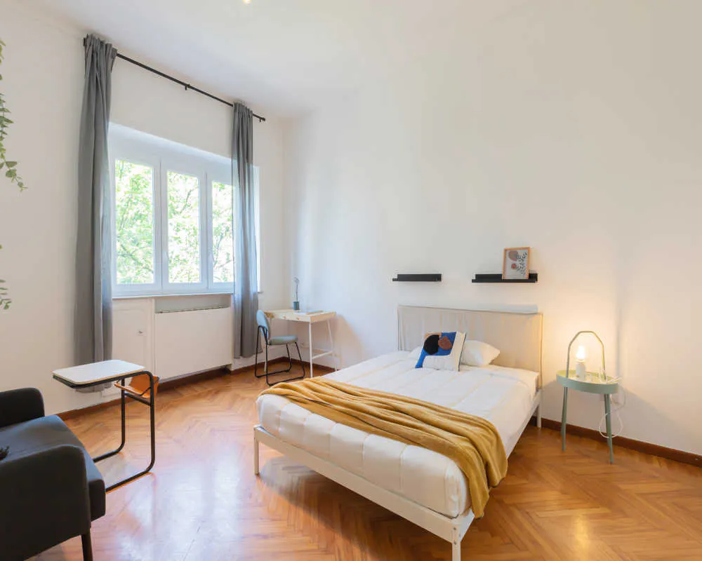 Single room in a shared apartment, composed by 6 bedrooms and 2 bathrooms. Of about 23 sqm with a one and a half bed and a work station. With wifi, air conditioning, bike parking, dishwasher, washing machine. Energy class: E, IPE 182.03 Kwh/Sqm year. Current tenants: 2: 24, Female, Worker 3: 27, Male, Student 4: 24, Female, Student 5: 28, Female, Student Please be aware that HousingAnywhere is an online booking platform. Therefore exchanging contact details and offering viewings is not possible. If you would like to reserve this accommodation, send me a booking request or a message and please mention your age and occupation. I look forward to talking to you! CONTRACT Please, note that to all our listings we apply fortnightly contracts. This means that If you check-in during the first half of the month, you will be charged for the full month. If you check-in during the second half of the month, you will only be charged for the second half. The second half of the month starts on the 16th. If you check-out during the first half of the month, you will only pay until the 15th of that month. If you check-out during the second half of the month, you will be charged the full month....