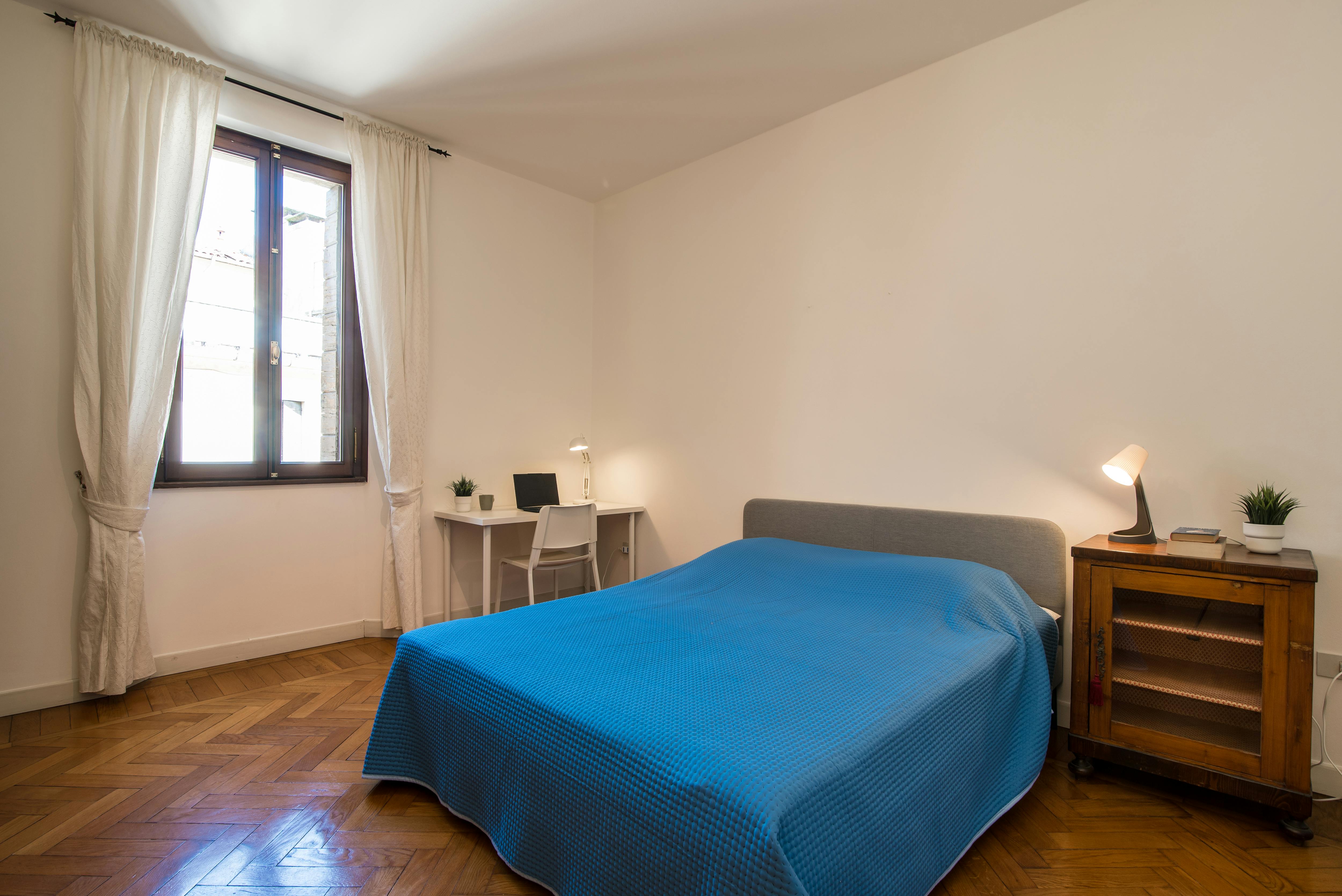 ROOM 6 - spacious and bright single room with a queen-sized bed in a completely renovated apartment with new furniture, three bathrooms, a laundry room, a warehouse, and a large kitchen. Six single rooms. The area is exceptionally safe inside the Historic center, 5 minutes from the hospital and the university. Supermarket within walking distance There is a private cellar for bicycle storage. Big terrace on the rooftop FIXED PERIODS: - from 01/09/2026 to 15/02/2027, 5,5 months or - from 01/09/2026 to 31/08/2027, 12 months Energy Performance Certificate (EPC) according to Italian law Legislative Decree no. 63/2013: D IPE: 269,56 KWh/mq year...