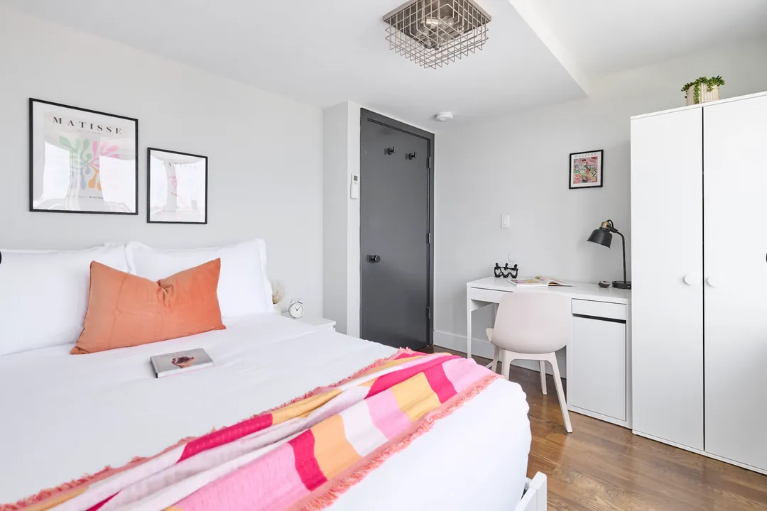 Nestled in Bushwick, just bordering Ridgewood, this shared apartment offers proximity to Maria Hernandez Park, a vibrant hub where young creatives gather to skate, dance, and exercise. Within a short 10-minute walk, you'll discover a trendy beer garden and the opportunity to indulge in a mouthwatering pizza slice from Artichoke. Venture a little further, and you'll encounter some of Queens' most impressive street art. Conveniently located near the L and M trains, transportation is easily accessible from this central location. Featuring six bedrooms and two bathrooms, this apartment boasts a spacious private outdoor area. Fully furnished and equipped with all household essentials and appliances, it also includes bi-monthly cleaning services for added convenience. On-site laundry facilities are available, along with access to a gym, lounge/workspace area, and a rooftop offering spectacular views of the Manhattan skyline. Your private space is furnished with a comfortable queen-sized bed, a functional desk with chair, and ample closet space, ensuring a comfortable and organized living experience. With all essentials provided, all you need to bring is your clothing to settle in and make this space your own. Please note: -The membership fee is a one-time payment of $200. - The broadcasting fee includes a 3% credit card processing fee...